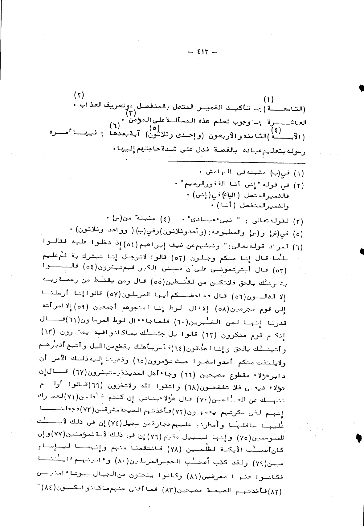 6 المراد قوله تعالى: {وَنَبِّئْهُمْ عَنْ ضَيْفِ إِبْرَاهِيمَ إِذْ دَخَلُوا عَلَيْهِ فَقَالُوا سَلاماً قَالَ إِنَّا مِنْكُمْ وَجِلُونَ قَالُوا لا تَوْجَلْ إِنَّا نُبَشِّرُكَ بِغُلامٍ عَلِيمٍ قَالَ أَبَشَّرْتُمُونِي عَلَى أَنْ مَسَّنِيَ الْكِبَرُ فَبِمَ تُبَشِّرُونَ قَالُوا بَشَّرْنَاكَ بِالْحَقِّ فَلا تَكُنْ مِنَ الْقَانِطِينَ قَالَ وَمَنْ يَقْنَطُ مِنْ رَحْمَةِ رَبِّهِ إِلَّا الضَّالُّونَ قَالَ فَمَا خَطْبُكُمْ أَيُّهَا الْمُرْسَلُونَ قَالُوا إِنَّا أُرْسِلْنَا إِلَى قَوْمٍ مُجْرِمِينَ إِلَّا آلَ لُوطٍ إِنَّا لَمُنَجُّوهُمْ أَجْمَعِينَ إِلَّا امْرَأَتَهُ قَدَّرْنَا إِنَّهَا لَمِنَ الْغَابِرِينَ فَلَمَّا جَاءَ آلَ لُوطٍ الْمُرْسَلُونَ قَالَ إِنَّكُمْ قَوْمٌ مُنْكَرُونَ قَالُوا بَلْ جِئْنَاكَ بِمَا كَانُوا فِيهِ يَمْتَرُونَ وَأَتَيْنَاكَ بِالْحَقِّ وَإِنَّا لَصَادِقُونَ فَأَسْرِ بِأَهْلِكَ بِقِطْعٍ مِنَ اللَّيْلِ وَاتَّبِعْ أَدْبَارَهُمْ وَلا يَلْتَفِتْ مِنْكُمْ أَحَدٌ وَامْضُوا حَيْثُ تُؤْمَرُونَ وَقَضَيْنَا إِلَيْهِ ذَلِكَ الْأَمْرَ أَنَّ دَابِرَ هَؤُلاءِ مَقْطُوعٌ مُصْبِحِينَ وَجَاءَ أَهْلُ الْمَدِينَةِ يَسْتَبْشِرُونَ قَالَ إِنَّ هَؤُلاءِ ضَيفِي فَلا تَفْضَحُونِ وَاتَّقُوا اللَّهَ وَلا تُخْزُونِ قَالُوا أَوَلَمْ نَنْهَكَ عَنِ الْعَالَمِينَ قَالَ هَؤُلاءِ بَنَاتِي إِنْ كُنْتُمْ فَاعِلِينَ لَعَمْرُكَ إِنَّهُمْ لَفِي سَكْرَتِهِمْ يَعْمَهُونَ فَأَخَذَتْهُمُ الصَّيْحَةُ مُشْرِقِينَ فَجَعَلْنَا عَالِيَهَا سَافِلَهَا وَأَمْطَرْنَا عَلَيْهِمْ حِجَارَةً مِنْ سِجِّيلٍ إِنَّ فِي ذَلِكَ لَآياتٍ لِلْمُتَوَسِّمِينَ وَإِنَّهَا لَبِسَبِيلٍ مُقِيمٍ إِنَّ فِي ذَلِكَ لَآيَةً لِلْمُؤْمِنِينَ وَإِنْ كَانَ أَصْحَابُ الْأَيْكَةِ لَظَالِمِينَ فَانْتَقَمْنَا مِنْهُمْ وَإِنَّهُمَا لَبِإِمَامٍ مُبِينٍ وَلَقَدْ كَذَّبَ أَصْحَابُ الْحِجْرِ الْمُرْسَلِينَ وَآتَيْنَاهُمْ آيَاتِنَا فَكَانُوا عَنْهَا مُعْرِضِينَ وَكَانُوا يَنْحِتُونَ مِنَ الْجِبَالِ بُيُوتاً آمِنِينَ فَأَخَذَتْهُمُ الصَّيْحَةُ مُصْبِحِينَ فَمَا أَغْنَى عَنْهُمْ مَا كَانُوا يَكْسِبُونَ} .
