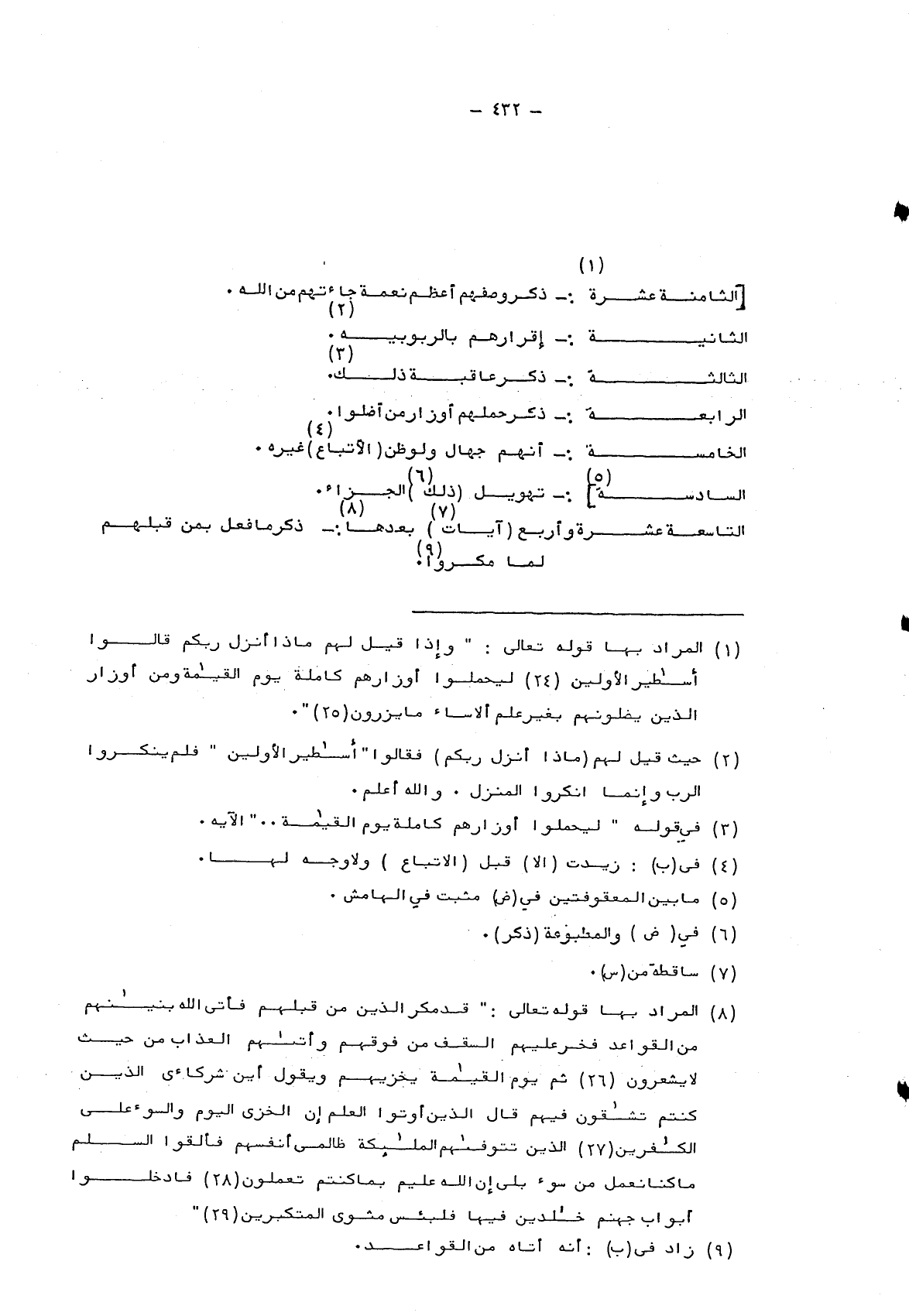 1 المراد بها قوله تعالى: {وَإِذَا قِيلَ لَهُمْ مَاذَا أَنْزَلَ رَبُّكُمْ قَالُوا أَسَاطِيرُ الْأَوَّلِينَ لِيَحْمِلُوا أَوْزَارَهُمْ كَامِلَةً يَوْمَ الْقِيَامَةِ وَمِنْ أَوْزَارِ الَّذِينَ يُضِلُّونَهُمْ بِغَيْرِ عِلْمٍ أَلا سَاءَ مَا يَزِرُونَ} .