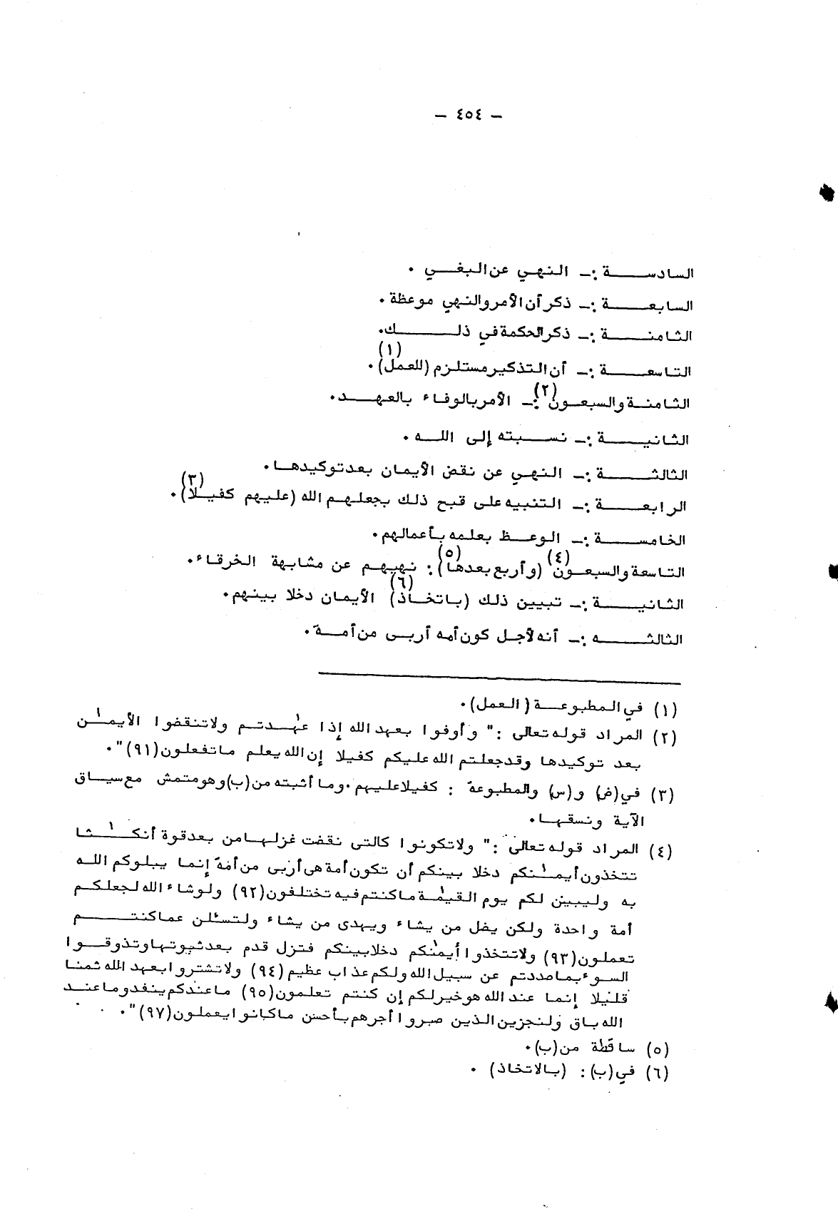 4 المراد قوله تعالى: {وَلا تَكُونُوا كَالَّتِي نَقَضَتْ غَزْلَهَا مِنْ بَعْدِ قُوَّةٍ أَنْكَاثاً تَتَّخِذُونَ أَيْمَانَكُمْ دَخَلاً بَيْنَكُمْ أَنْ تَكُونَ أُمَّةٌ هِيَ أَرْبَى مِنْ أُمَّةٍ إِنَّمَا يَبْلُوكُمُ اللَّهُ بِهِ وَلَيُبَيِّنَنَّ لَكُمْ يَوْمَ الْقِيَامَةِ مَا كُنْتُمْ فِيهِ تَخْتَلِفُونَ وَلَوْ شَاءَ اللَّهُ لَجَعَلَكُمْ أُمَّةً وَاحِدَةً وَلَكِنْ يُضِلُّ مَنْ يَشَاءُ وَيَهْدِي مَنْ يَشَاءُ وَلَتُسْأَلُنَّ عَمَّا كُنْتُمْ تَعْمَلُونَ وَلا تَتَّخِذُوا أَيْمَانَكُمْ دَخَلا بَيْنَكُمْ فَتَزِلَّ قَدَمٌ بَعْدَ ثُبُوتِهَا وَتَذُوقُوا السُّوءَ بِمَا صَدَدْتُمْ عَنْ سَبِيلِ اللَّهِ وَلَكُمْ عَذَابٌ عَظِيمٌ وَلا تَشْتَرُوا بِعَهْدِ اللَّهِ ثَمَناً قَلِيلاً إِنَّمَا عِنْدَ اللَّهِ هُوَ خَيْرٌ لَكُمْ إِنْ كُنْتُمْ تَعْلَمُونَ مَا عِنْدَكُمْ يَنْفَدُ وَمَا عِنْدَ اللَّهِ بَاقٍ وَلَنَجْزِيَنَّ الَّذِينَ صَبَرُوا أَجْرَهُمْ بِأَحْسَنِ مَا كَانُوا يَعْمَلُونَ} .