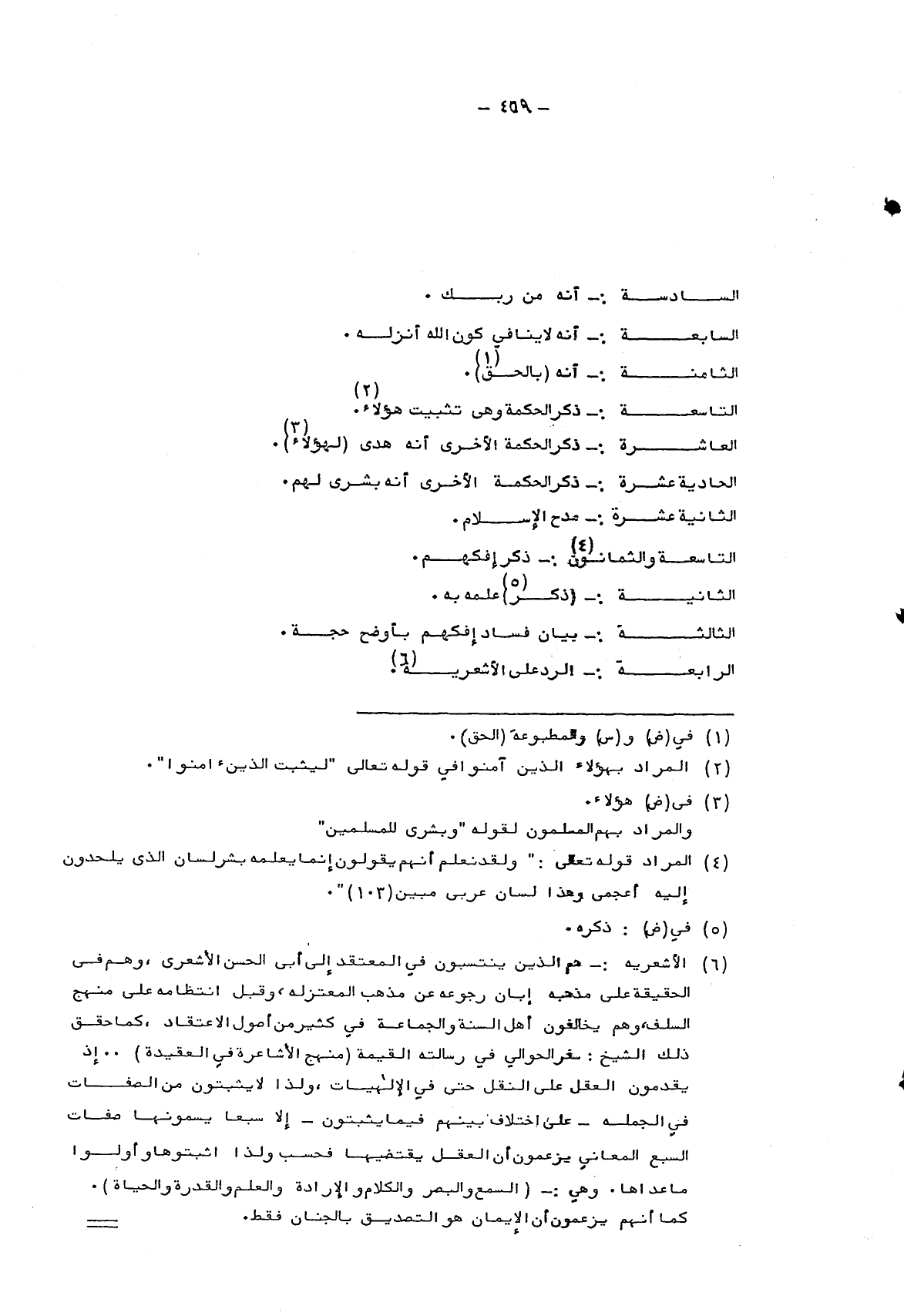 6 الأشعريه: هم الذين ينتسبون في المعتقد إلى أبي الحسن الأشعري، وهم في الحقيقة على مذهبه إبان رجوعه عن مذهب المعتزلة، وقبل انتظامه على منهج السلف، وهم يخالفون أهل السنة والجماعة في كثير من أصول الاعتقاد، كما حقق ذلك الشيخ: سفر الحوالي في رسالته القيمة "منهج الأشاعرة في العقيدة".. إذ يقدمون العقل على النقل حتى في الإلهيات، ولذا لا يثبتون من الصفات في الجملة- على اختلاف بينهم فيما يثبتون- إلا سبعا يسمونها صفات السبع المعاني يزعمون أن العقل يقتضيها فحسب ولذا أثبتوها وأولوا ما عداها. وهي: "السمع والبصر والكلام والإرادة والعلم والقدرة والحياة".