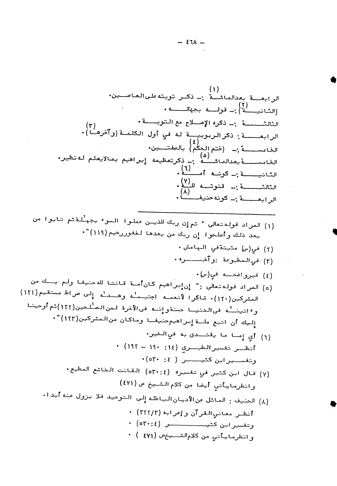 5 المراد قوله تعالى: {إِنَّ إِبْرَاهِيمَ كَانَ أُمَّةً قَانِتاً لِلَّهِ حَنِيفاً وَلَمْ يَكُ مِنَ الْمُشْرِكِينَ شَاكِراً لَأَنْعُمِهِ اجْتَبَاهُ وَهَدَاهُ إِلَى صِرَاطٍ مُسْتَقِيمٍ وَآتَيْنَاهُ فِي الدُّنْيَا حَسَنَةً وَإِنَّهُ فِي الْآخِرَةِ لَمِنَ الصَّالِحِينَ ثُمَّ أَوْحَيْنَا إِلَيْكَ أَنِ اتَّبِعْ مِلَّةَ إِبْرَاهِيمَ حَنِيفاً وَمَا كَانَ مِنَ الْمُشْرِكِينَ} .