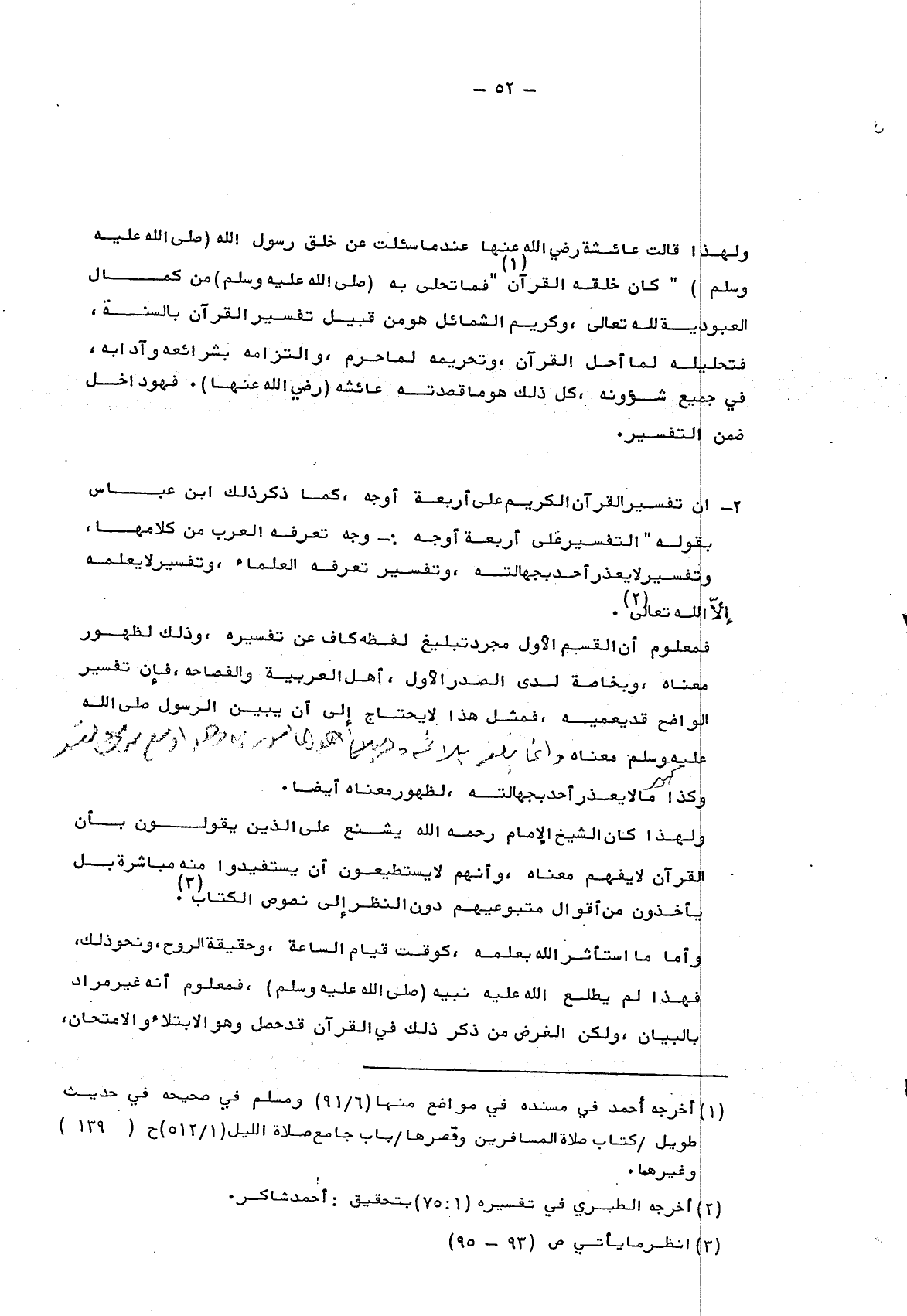 2- أن تفسير القرآن الكريم على أربعة أوجه، كما ذكر ذلك ابن عباس بقوله "التفسير على أربعة أوجه: وجه تعرفه العرب من كلاهما، وتفسير لا يعذر أحد بجهالته، وتفسير تعرفه العلماء، وتفسير لا يعلمه إلا الله تعالى2.