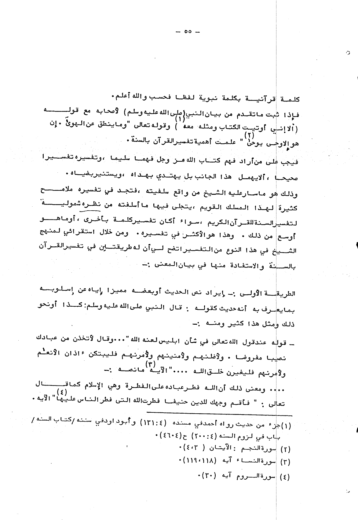وذلك هو ما سار عليه الشيخ من واقع سلفيته، فتجد في تفسيره ملامح كثيرة لهذا المسلك القويم، يتجلى فيها ما أسلفته من نظره شمولية لتفسير السنة للقرآن الكريم، سواء أكان تفسير كلمة بأخرى، أو ما هو أوسع من ذلك. وهذا هو الأكثر في تفسيره. ومن خلال استقرائي لمنهج الشيخ في هذا النوع من التفسير أتضح لي أن له طريقتين في تفسير القرآن بالسنة والاستفادة منها في بيان المعنى:-