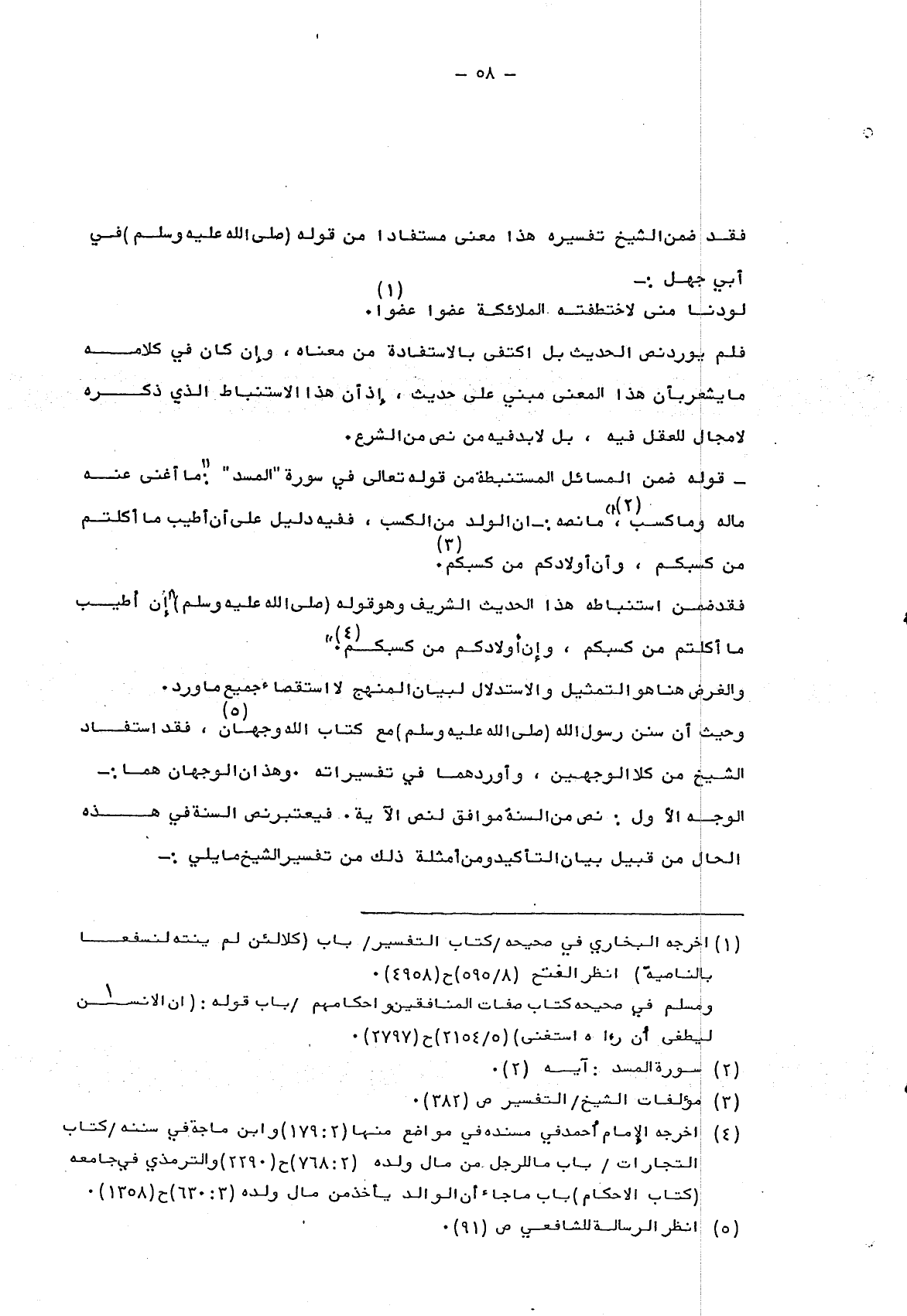 - قوله فمن المسائل المستنبطة من قوله تعالى في سورة "المسد": {مَا أَغْنَى عَنْهُ مَالُهُ وَمَا كَسَبَ} 2 ما نصه:- إن الولد من الكسب، ففيه دليل على أن أطيب ما أكلتم من كسبكم، وأن أولادكم من كسبكم3.