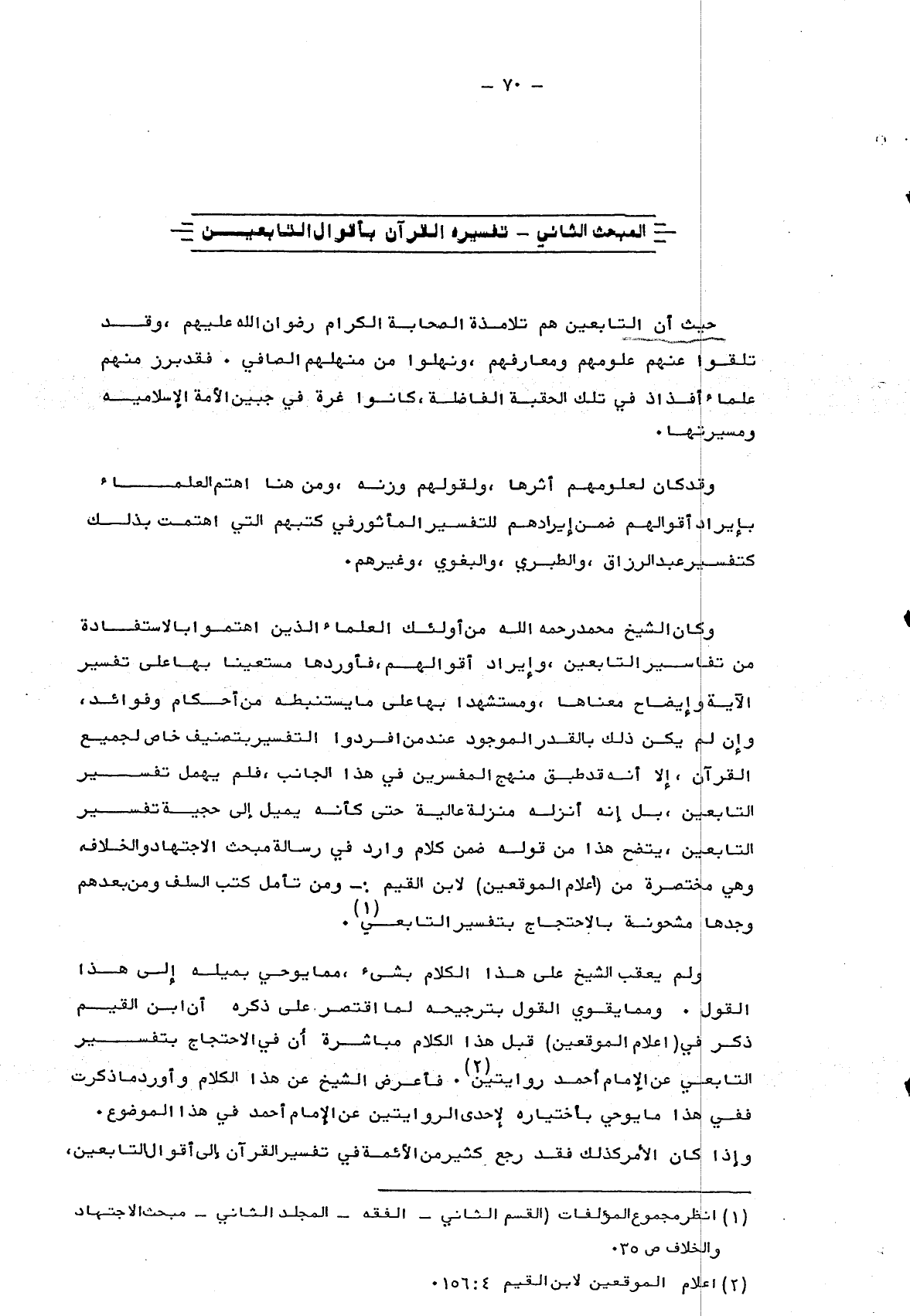 ولم يعقب الشيخ على هذا الكلام بشيء، مما يوحي بميله إلى هذا القول. ومما يقوي القول بترجيحه لما اقتصر على ذكره أن ابن القيم ذكر في "إعلام الموقعين" قبل هذا الكلام مباشرة أن في الاحتجاج بتفسير التابعي عن الإمام أحمد روايتين2. فأعرض الشيخ عن هذا الكلام وأورد ما ذكرت ففي هذا ما يوحي باختياره لإحدى الروايتين عن الإمام أحمد في هذا الموضوع.