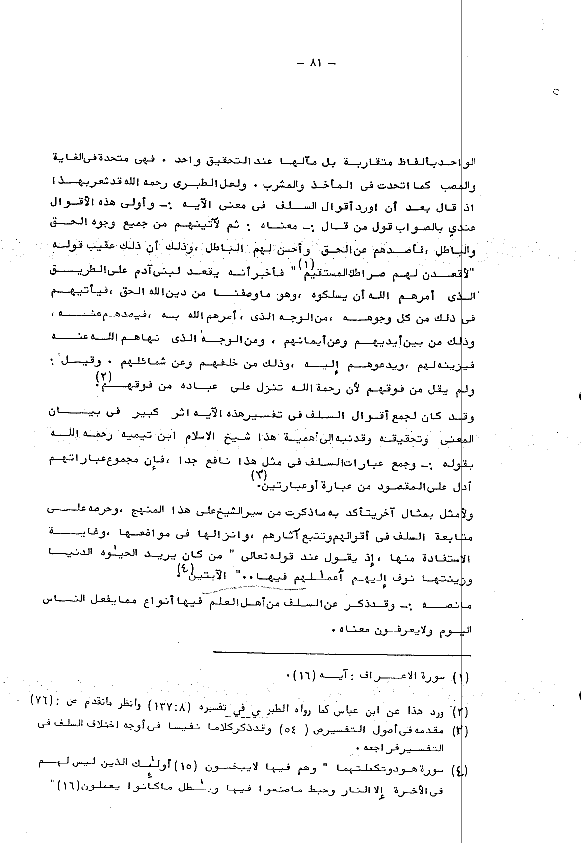 وقد كان لجمع أقوال السلف فى تفسير هذه الآية أثر كبير في بيان المعنى وتحقيقه وقد نبه إلى أهمية هذا شيخ الإسلام ابن تيميه رحمه الله بقوله:- وجمع عبارات السلف في مثل هذا نافع جداً، فإن مجموع عباراتهم أدل على المقصود من عبارة أو عبارتين3.