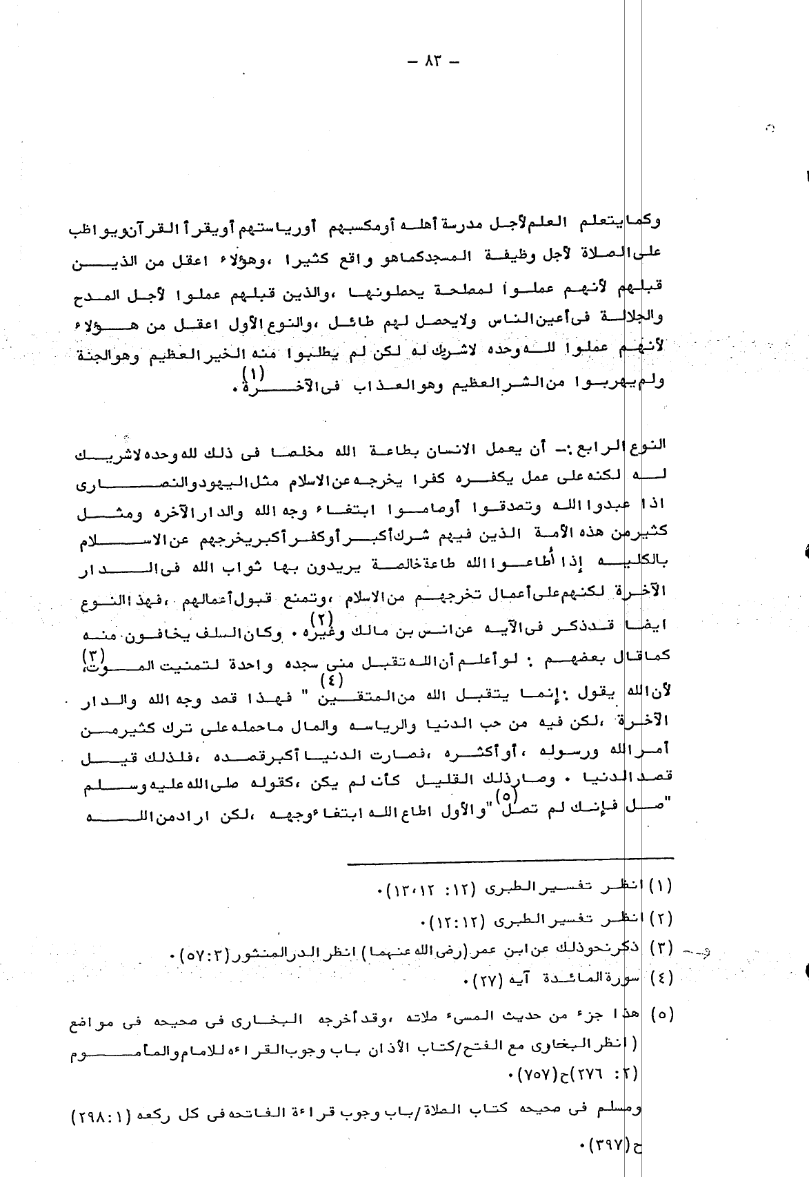 وكما يتعلم العلم لأجل مدرسة أهله أو مكسبهم أو رياستهم أو يقرأ القرآن ويواظب على الصلاة لأجل وظيفة المسجد كما هو واقع كثيراً، وهؤلاء اعقل من الذين قبلهم لأنهم عملوا لمصلحة يحصلونها، والذين قبلهم عملوا لأجل المدح والجلالة في أعين الناس ولا يحصل لهم طائل، والنوع الأول اعقل من هؤلاء لأنهم عملوا لله وحده لا شريك له لكن لم يطلبوا منه الخير العظيم وهو الجنة ولم يهربوا من الشر العظيم وهو العذاب في الآخرة1.
