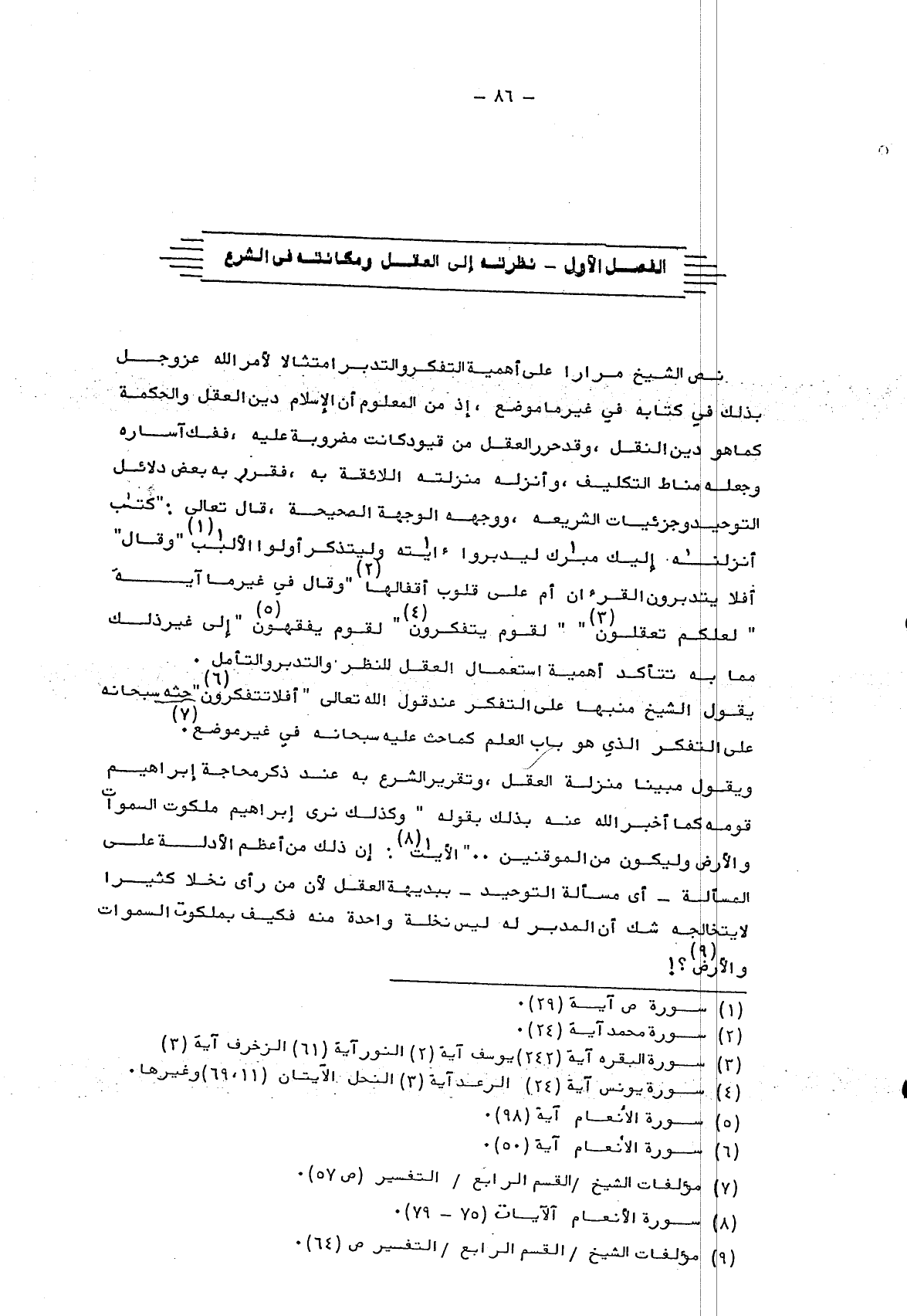 نص الشيخ مراراً على أهمية التفكر والتدبر امتثالاً لأمر الله عز وجل بذلك في كتابه في غير ما موضع، إذ من المعلوم أن الإسلام دين العقل والحكمة كما هو دين النقل، وقد حرر العقل من قيود كانت مضروبة عليه، ففك آساره وجعله مناط التكليف، وأنزله منزلته اللائقة به، فقرر به بعض دلائل التوحيد وجزئيات الشريعة، ووجهه الوجهة الصحيحة، قال تعالى: {كِتَابٌ أَنْزَلْنَاهُ إِلَيْكَ مُبَارَكٌ لِيَدَّبَّرُوا آيَاتِهِ وَلِيَتَذَكَّرَ أُولُو الْأَلْبَابِ} 1، وقال: {أَفَلا يَتَدَبَّرُونَ الْقُرْآنَ أَمْ عَلَى قُلُوبٍ أَقْفَالُهَا} 2، وقال في غير ما آية: {لَعَلَّكُمْ تَعْقِلُونَ} 3: {لِقَوْمٍ يَتَفَكَّرُونَ} 4: {لِقَوْمٍ يَفْقَهُونَ} 5 إلى غير ذلك مما به تتأكد أهمية استعمال العقل للنظر والتدبر والتأمل.