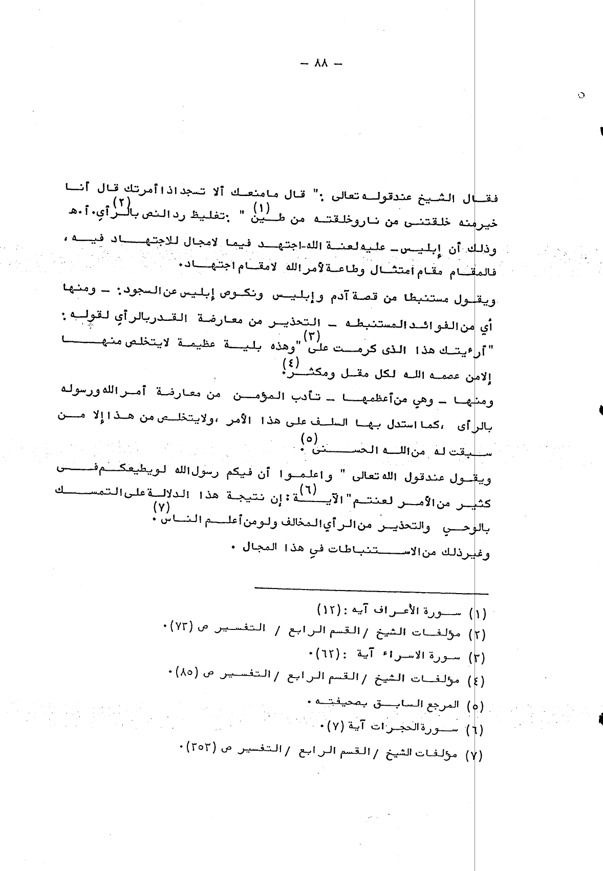 فقال الشيخ عند قوله تعالى: {قَالَ مَا مَنَعَكَ أَلَّا تَسْجُدَ إِذْ أَمَرْتُكَ قَالَ أَنَا خَيْرٌ مِنْهُ خَلَقْتَنِي مِنْ نَارٍ وَخَلَقْتَهُ مِنْ طِينٍ} 1: تغليظ رد النص بالرأي2.أ. هـ وذلك أن إبليس- عليه لعنة الله- اجتهد فيما لا مجال للاجتهاد فيه، فالمقام مقام امتثال وطاعة لأمر الله لا مقام اجتهاد.