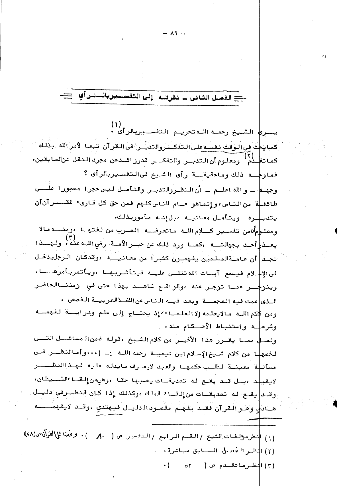 كما يحث في الوقت نفسه على التفكر والتدبر في القرآن تبعاً لأمر الله بذلك كما تقدم2 ومعلوم أن التدبر والتفكر قدر زائد عن مجرد النقل عن السابقين. فما وجه ذلك وما حقيقة رأي الشيخ في التفسير بالرأي؟
