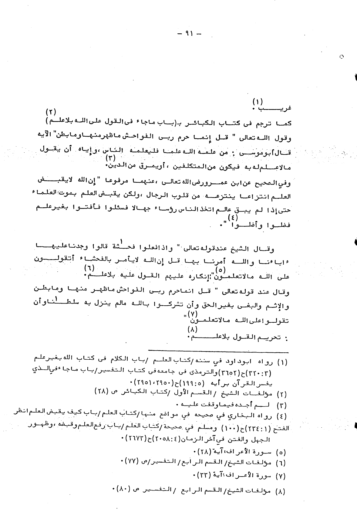 وقال عند قوله تعالى: {قُلْ إِنَّمَا حَرَّمَ رَبِّيَ الْفَوَاحِشَ مَا ظَهَرَ مِنْهَا وَمَا بَطَنَ وَالْأِثْمَ وَالْبَغْيَ بِغَيْرِ الْحَقِّ وَأَنْ تُشْرِكُوا بِاللَّهِ مَا لَمْ يُنَزِّلْ بِهِ سُلْطَاناً وَأَنْ تَقُولُوا عَلَى اللَّهِ مَا لا تَعْلَمُونَ} 7: تحريم القول بلا علم8.