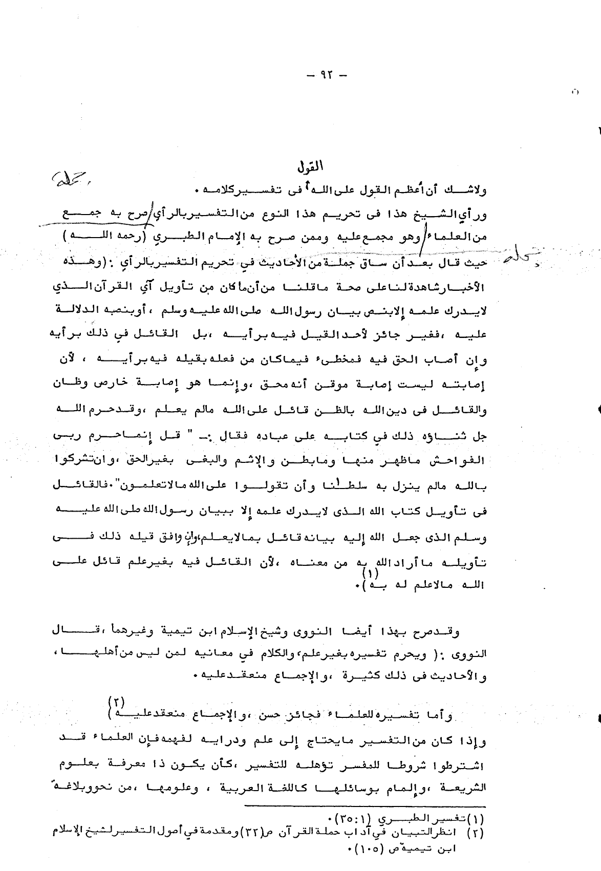 ورأي الشيخ هذا في تحريم هذا النوع من التفسير بالرأي صرح به جمع من العلماء وهو مجمع عليه وممن صرح به الإمام الطبري "رحمه الله" حيث قال بعد أن ساق جملة من الأحاديث في تحريم التفسير بالرأي: "وهذه الأخبار شاهدة لنا على صحة ما قلنا من أن ما كان من تأويل آي القرآن الذي لا يدرك علمه إلا بنص بيان رسول الله صلى الله عليه وسلم، أو بنصبه الدلالة عليه، فغير جائز لأحد القيل فيه برأيه، بل القائل في ذلك برأيه وإن أصاب الحق فيه فمخطئ فيما كان من فعله بقيله فيه برأيه، لان إصابته ليست إصابة موقن أنه محق، وإنما هو إصابة خارص وظان ولقائل في دين الله بالظن قائل على الله ما لم يعلم، وقد حرم الله جل ثناؤه ذلك في كتابه على عباده فقال: {قُلْ إِنَّمَا حَرَّمَ رَبِّيَ الْفَوَاحِشَ مَا ظَهَرَ مِنْهَا وَمَا بَطَنَ وَالْأِثْمَ وَالْبَغْيَ بِغَيْرِ الْحَقِّ وَأَنْ تُشْرِكُوا بِاللَّهِ مَا لَمْ يُنَزِّلْ بِهِ سُلْطَاناً وَأَنْ تَقُولُوا عَلَى اللَّهِ مَا لا تَعْلَمُونَ} ، فالقائل في تأويل كتاب الله الذي لا يدرك علمه إلا ببيان رسول الله صلى الله عليه وسلم الذي جعل الله إليه بيانه قائل بما لا يعلم، وإن وافق قيله ذلك في تأويله ما أراد الله به من معناه، لأن القائل فيه بغير علم قائل على الله ما لا علم له به1".