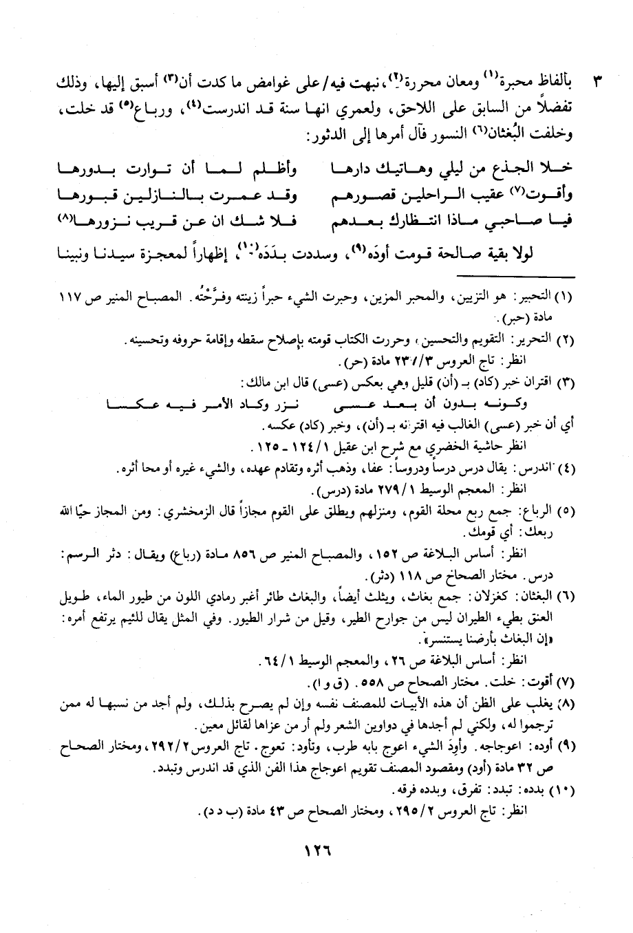 بألفاظ محبرة (¬1) ومعان محررة (¬2)، نبهت فيه على غوامض ما كدت أن (¬3) أسبق إليها، وذلك تفضلًا من السابق على اللاحق، ولعمري أنها سنة قد اندرست (¬4)، ورباع (¬5) قد خلت، وخلفت البُغثان (¬6) النسور قال أمرها إلى الدثور: