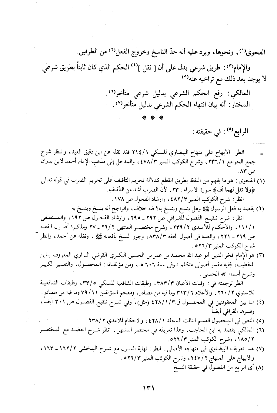 (¬7) هذا تعريف البيضاوي في منهاجه الأصلي. انظر: نهاية السول مع شرح البدخشي 2/ 162 - 163، والابهاج على المنهاج 2/ 247، وشرح الكوكب المنير 3/ 526.