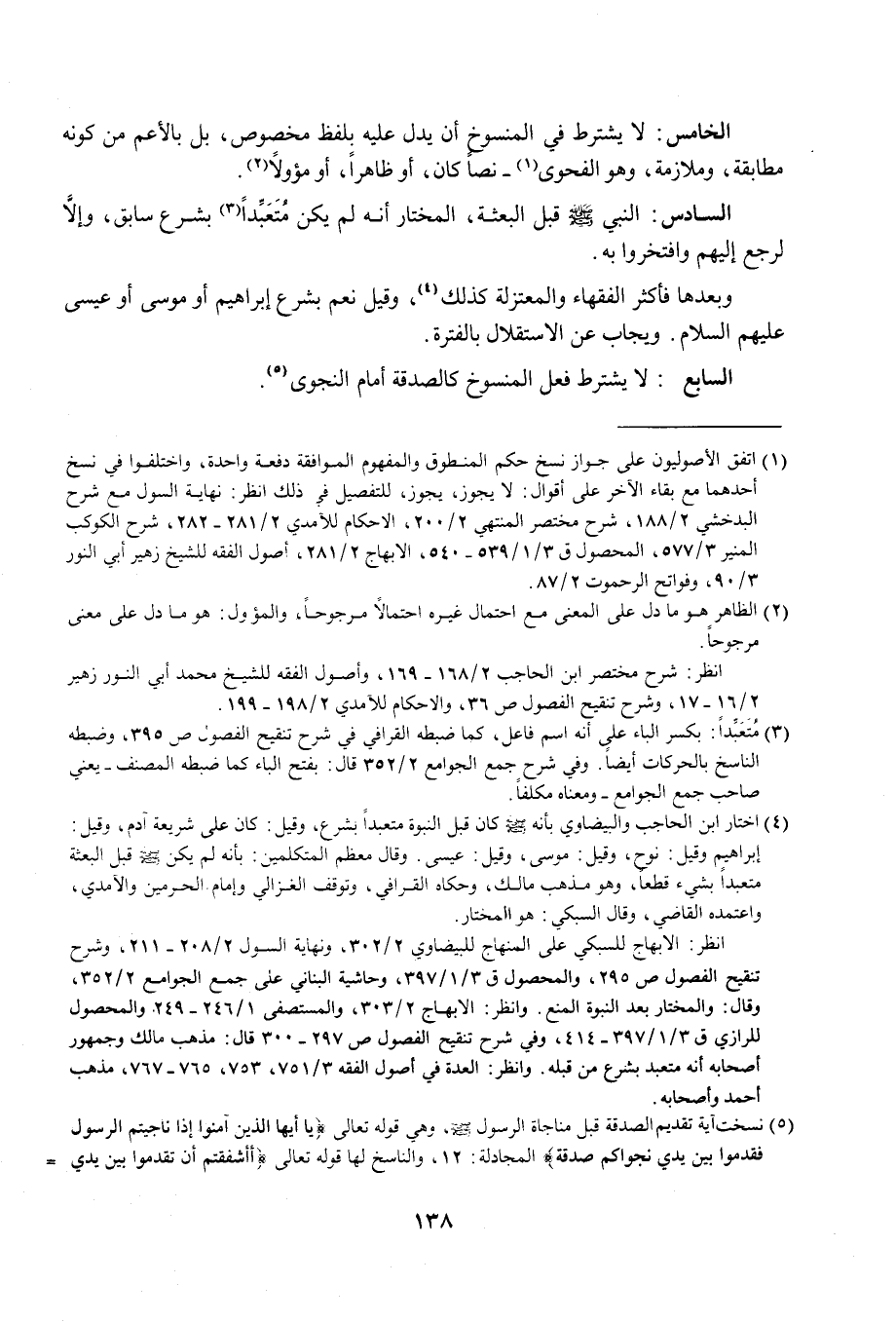 (¬4) اختار ابن الحاجب والبيضاوي بأنه - صلى الله عليه وسلم - كان قبل النبوة متعبدًا بشرع، وقيل. كان على شريعة آدم، وقيل: إبراهيم وقيل: نوح، وقيل: موسى، وقيل: عيسى. وقال معظم المتكلمين: بأنه لم يكن - صلى الله عليه وسلم - قبل البعثة متعبدًا بشيء قطعًا، وهو مذهب مالك، وحكاه القرافي، وتوقف الغزالي وإمام الحرمين والآمدي، واعتمده القاضي، وقال السبكي: هو المختار.