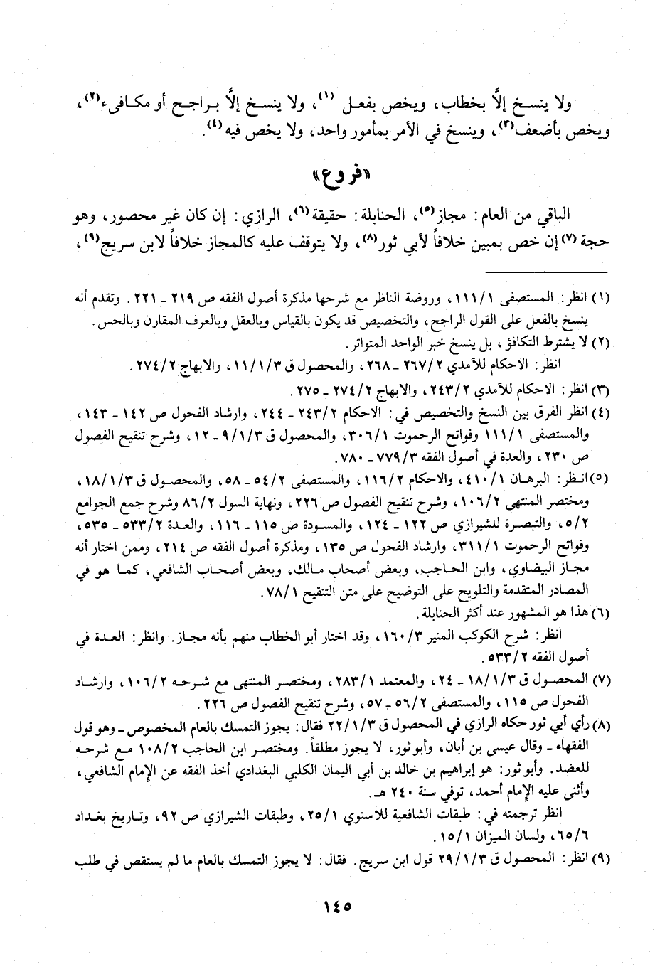 (¬4) انظر الفرق بين النسخ والتخصيص في: الإحكام 2/ 243 - 244، وإرشاد الفحول ص 142 - 143، والمستصفى 1/ 111 وفواتح الرحموت 1/ 306، والمحصول ق 3/ 1/ 9 - 12، وشرح تنقيح الفصول ص 230، والعدة في أصول الفقه 3/ 779 - 780.