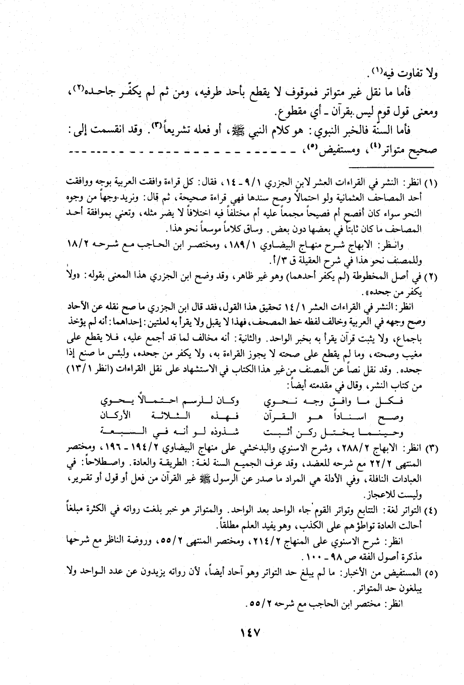 انظر: النشر في القراءات العشر 1/ 14 تحقيق هذا القول، فقد قال ابن الجزري ما صح نقله عن الآحاد وصح وجهه في العربية وخالف لفظه خط المصحف، فهذا لا يقبل ولا يقرأ به لعلتين: إحداهما: أنَّه لم يؤخذ باجماع، ولا يثبت قرآن يقرأ به بخبر الواحد. والثانية: أنَّه مخالف لما قد أجمع عليه، فلا يقطع على مغيب وصحته، وما لم يقطع على صحته لا يجوز القراءة به، ولا يكفر من جحده، ولبئس ما صنع إذا جحده. وقد نقل نصًا عن المصنف من غير هذا الكتاب في الاستشهاد على نقل القراءات (انظر 1/ 13) من كتاب النشر، وقال في مقدمته أَيضًا: