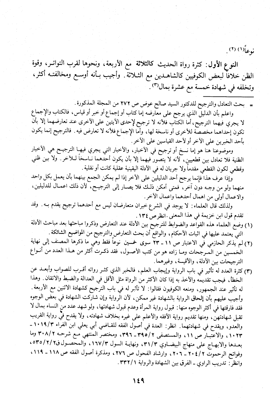 النوع الأول: كثرة رواة الحديث كالثلاثة مع الأربعة، ونحوها لقرب التواتر، وقوة الظن خلافًا لبعض الكوفيين كالشاهدين مع الثلاثة. وأجيب بأنه أوسع ومخالفته أكثر، وتخلفه في شهادة خمسة مع عشرة بمال (¬3).