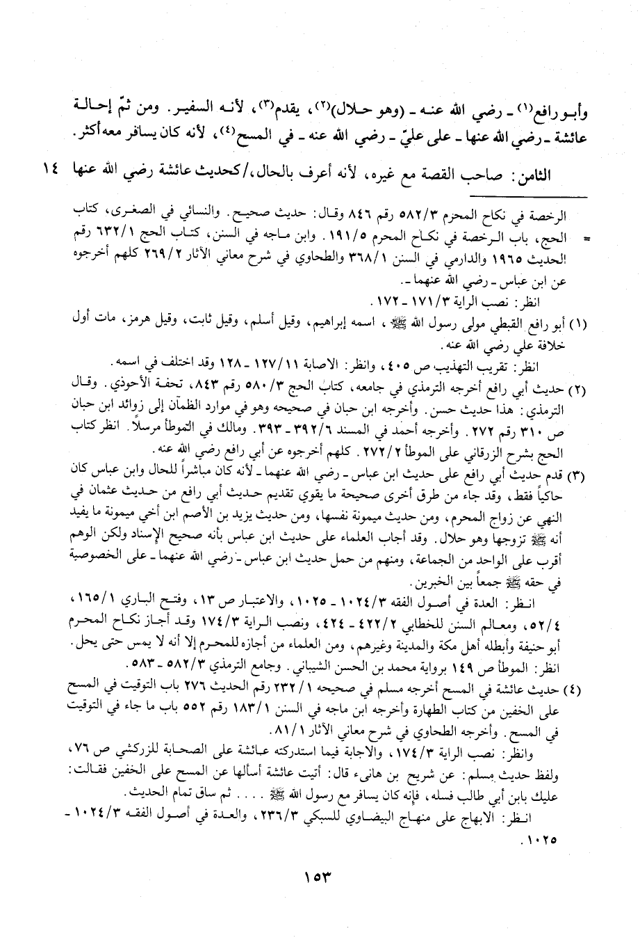 (¬3) قدم حديث أبي رافع على حديث ابن عباس -رضي الله عنهما- لأنه كان مباشرًا للحال وابن عباس كان حاكيًا فقط، وقد جاء من طرق أخرى صحيحة ما يقوي تقديم حديث أبي رافع من حديث عثمان في النهي عن زواج المحرم، ومن حديث ميمونة نفسها، ومن حديث يزيد بن الأصم ابن أخي ميمونة ما يفيد أنه - صلى الله عليه وسلم - تزوجها وهو حلال. وقد أجاب العلماء على حديث ابن عباس بأنه صحيح الإِسناد ولكن الوهم أقرب على الواحد من الجماعة، ومنهم من حمل حديث ابن عباس- رضي الله عنهما- على الخصوصية في حقه - صلى الله عليه وسلم - جمعًا بين الخبرين.