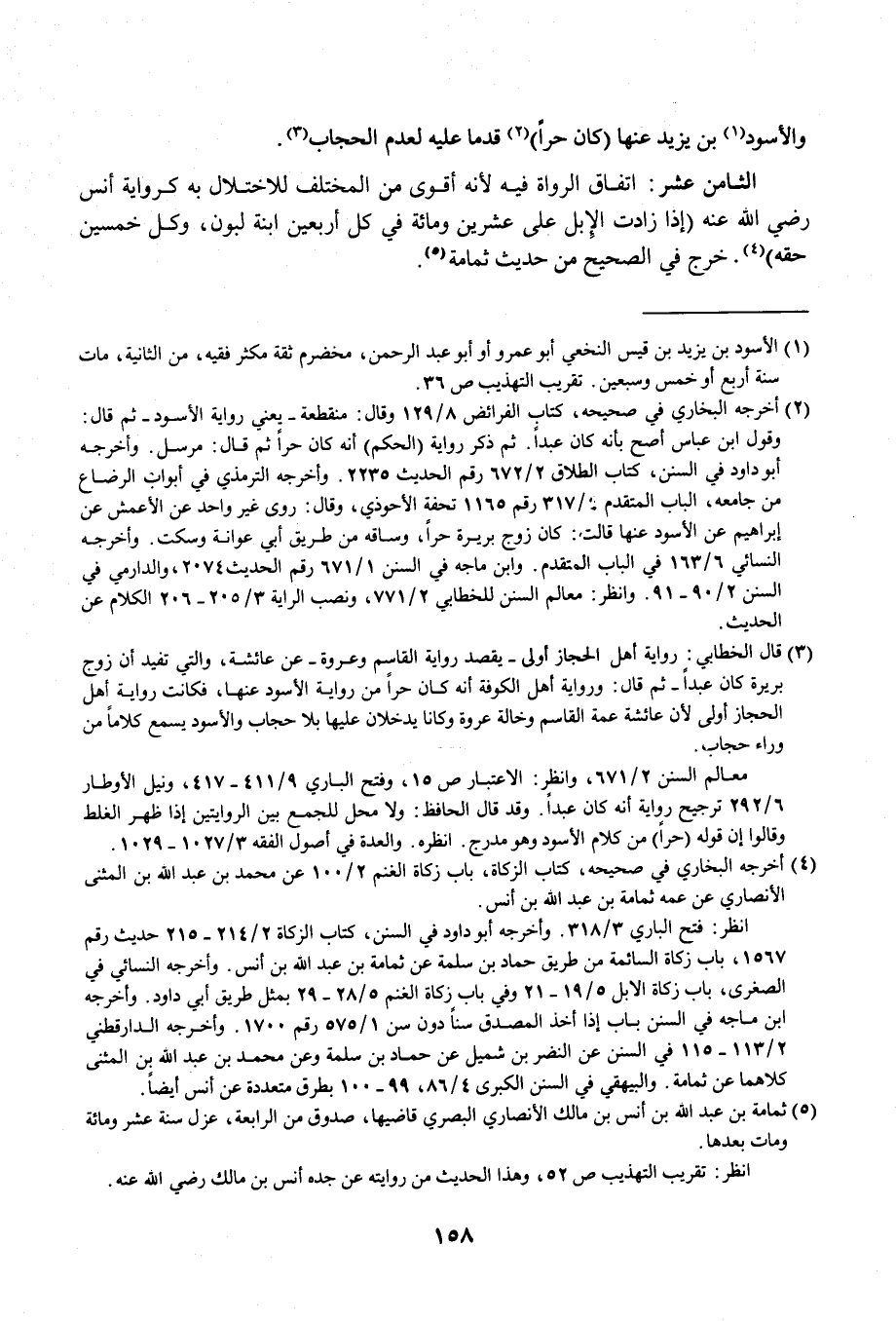 الثامن عشر: اتفاق الرواة فيه لأنه أقوى من المختلف للاختلال به كرواية أنس رضي الله عنه (إذا زادت الإبل على عشرين ومائة في كل أربعين ابنة لبون، وكل خمسين حقه) (¬4). خرج في الصحيح من حديث ثمامة (¬5).