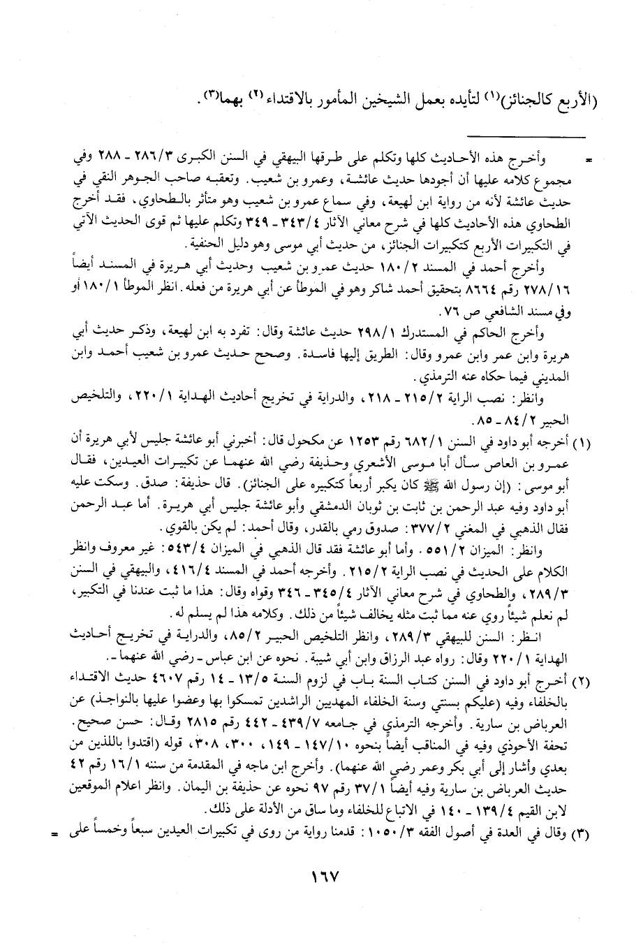 = أخرج هذه الأحاديث كلها وتكلم على طرقها البيهقي في السنن الكبرى 3/ 286 - 288 وفي مجموع كلامه عليها أن أجودها حديث عائشة، وعمرو بن شعيب. وتعقبه صاحب الجوهر النقي في حديث عائشة لأنه من رواية ابن لهيعة، وفي سماع عمرو بن شعيب وهو متأثر بالطحاوي، فقد أخرج الطحاوي هذه الأحاديث كلها في شرح معاني الآثار 4/ 343 - 349 وتكلم عليها ثم قوى الحديث الآتي في التكبيرات الأربع كتكبيرات الجنائز، من حديث أبي موسى وهو دليل الحنفية.