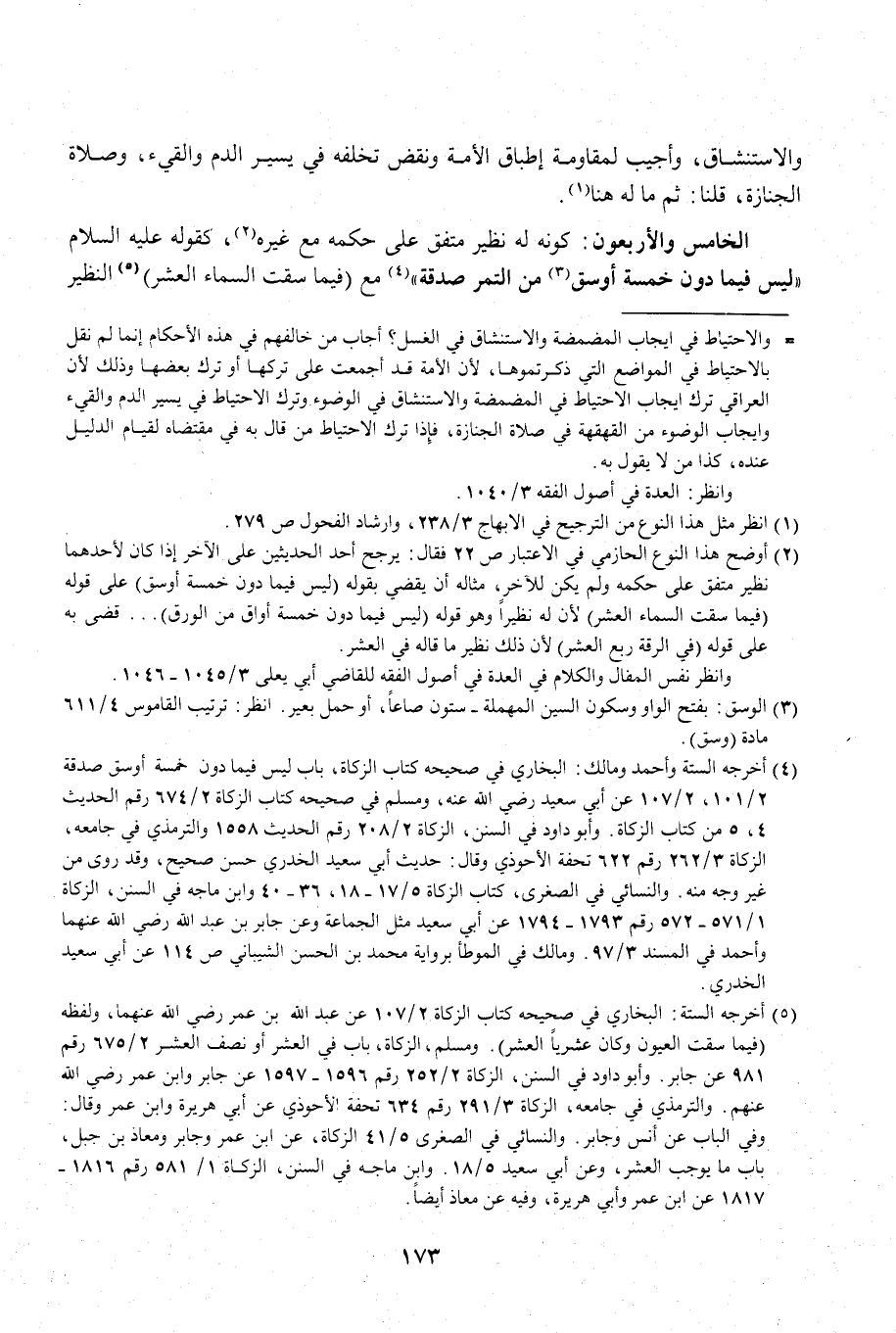 (¬5) أخرجه الستة: البخاري في صحيحه كتاب الزكاة 2/ 107 عن عبد الله بن عمر رضي الله عنهما، ولفظه (فيما سقت العيون وكان عشريًا العشر). ومسلم، الزكاة، باب في العشر أو نصف العشر 2/ 675 رقم 981 عن جابر، وأبو داود في السنن، الزكاة 2/ 252 رقم 1596 - 1597 عن جابر وابن عمر رضي الله عنهم. والترمذي في جامعه، الزكاة 3/ 291 رقم 634 تحفة الأحوذي عن أبي هريرة وابن عمر وقال: وفي الباب عن أنس وجابر. والنسائي في الصغرى 5/ 41 الزكاة، عن ابن عمر وجابر ومعاذ بن جبل، باب ما يوجب العشر، وعن أبي سعيد 5/ 18. وابن ماجه في السنن، الزكاة 1/ 581 رقم 1816 - 1817 عن ابن عمر وأبي هريرة، وفيه عن معاذ أيضًا.