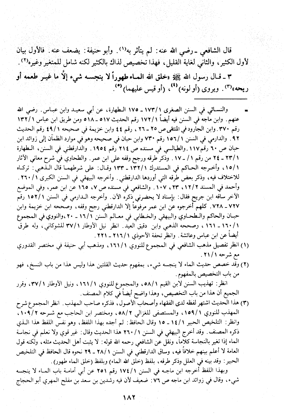 (¬3) هذا الحديث اشتهر لفظه لدى الفقهاء وأصحاب الأصول، فذكره صاحب المهذب. انظر المجموع شرح المهذب للنووي 1/ 159، والمستصفى للغزالي 2/ 58، ومختصر ابن الحاجب مع شرحه 2/ 109، وانظر: التلخيص الحبير 1/ 14 - 15 وقال الحافظ: لم أجده بهذا اللفظ، وهو نفس اللفظ هذا الذي ذكره المصنف. وقد أخرج البيهقي في السنن 1/ 260 هذا الحديث وقال: غير قوي ولا نعلم في نجاسة الماء إذا تغير بالنجاسة كلامًا، ونقل عن الشافعي رحمه الله قوله: لا يثبت أهل الحديث مثله، ولكنه قول العامة لا أعلم بينهم خلافًا فيه، وساق الدارقطني في السنن 1/ 28 - 29 نحوه قال الحافظ في التلخيص الحبير: وقد بينه في العلل وذكر طرقه، بلفظ (خلق الله الماء) وبلفظ (خلق الماء طهور).