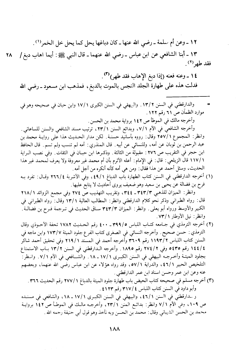 (¬2) أخرجه الترمذي في جامعه كتاب اللباس 5/ 399 - 400 رقم الحديث 1782 تحفة الأحوذي وقال الترمذي: حسن صحيح. وأخرجه النسائي في الصغرى كتاب الفرع جلود الميتة 7/ 173 وابن ماجه في السنن كتاب اللباس 2/ 1193 رقم 3609 وأخرجه أحمد في المسند 1/ 219 وفي تحقيق أحمد شاكر 4/ 144 رقم 5435 وفي 2/ 274 رقم 1895. وأخرجه الدارقطني في السنن 2/ 13 باب الاستمتاع بجلود الميتة وأخرجه البيهقي في السنن الكبرى 1/ 17 - 18. والشافعي في الأم 1/ 7. وانظر: التلخيص الحبير 1/ 46، والدراية 1/ 57، وقد رواه هؤلاء عن ابن عباس رضي الله عنهما، وبعضهم عنه وعن ابن عمر وحسن إسناد ابن عمر الدارقطني.