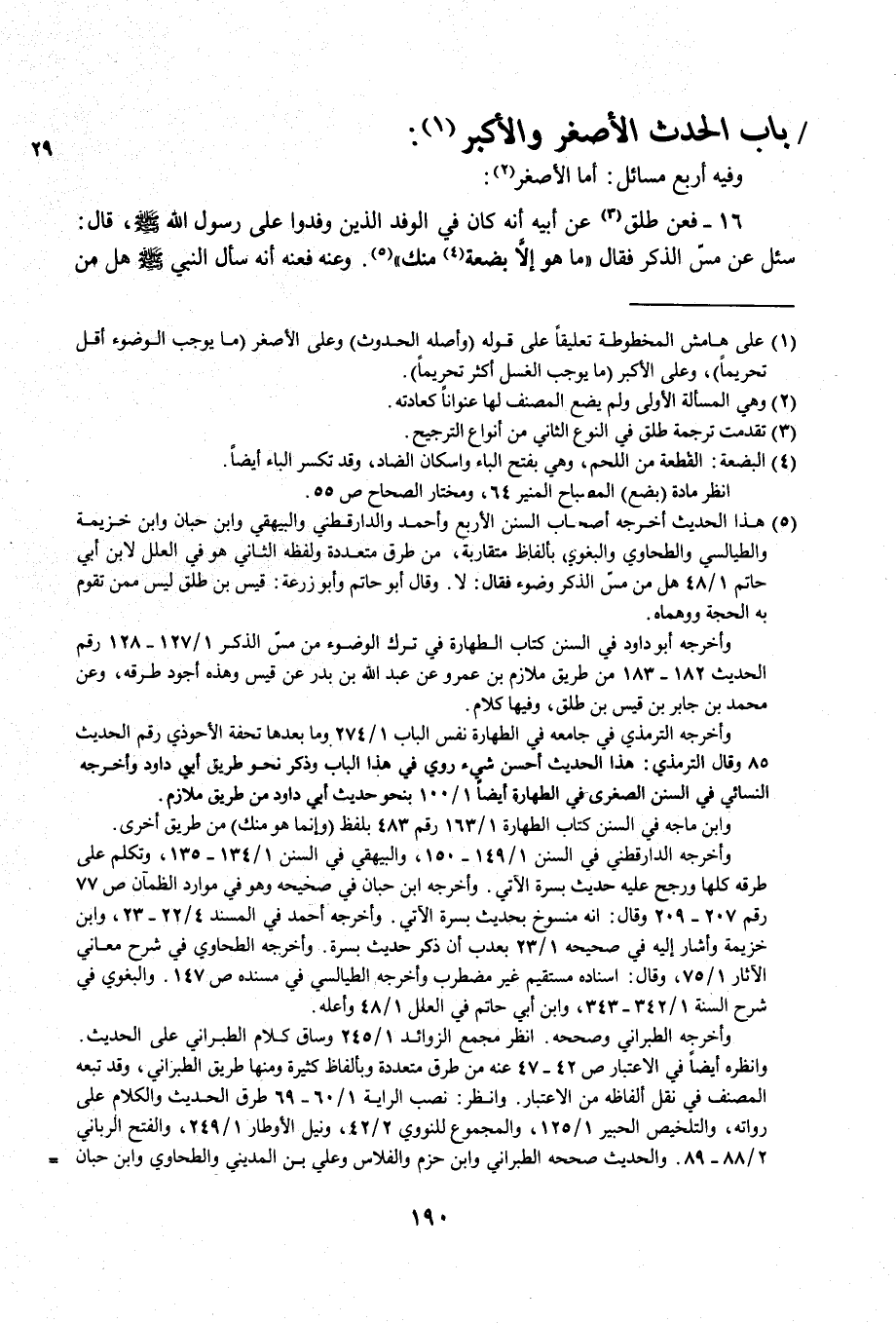 (¬5) هذا الحديث أخرجه أصحاب السنن الأربع وأحمد والدارقطني والبيهقي وابن حبان وابن خزيمة والطيالسي والطحاوي والبغوي بألفاظ متقاربة، من طرق متعددة ولفظه الثاني هو في العلل لابن أبي حاتم 1/ 48 هل من مسّ الذكر وضوء فقال: لا. وقال أبو حاتم وأبو زرعة: قيس بن طلق ليس ممن تقوم به الحجة ووهماه.