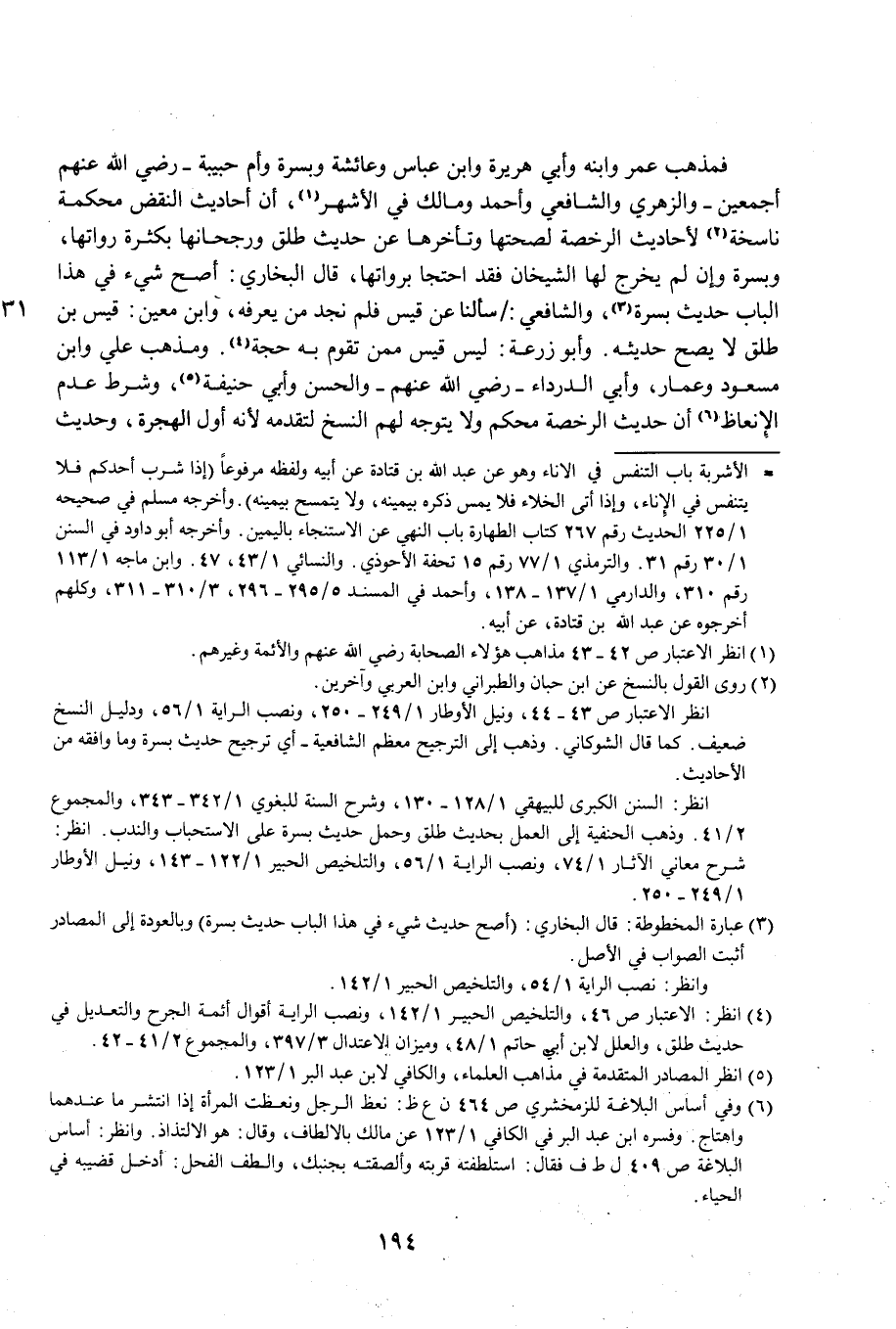 انظر الاعتبار ص 43 - 44، ونيل الأوطار 1/ 249 - 250، ونصب الراية 1/ 56، ودليل النسخ ضعيف. كما قال الشوكاني. وذهب إلى الترجيح معظم الشافعية - أي ترجيح حديث بسرة وما وافقه من الأحاديث.