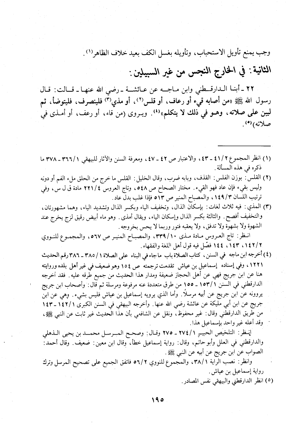 22 - أبنا الدارقطني وابن ماجه عن عائشة -رضي الله عنها- قالت: قال رسول الله - صلى الله عليه وسلم - "من أصابه قيء أو رعاف، أو قلس (¬2)، أو مذي (¬3) فلينصرف، فليتوضأ، ثم ليبن علي صلاته، وهو في ذلك لا يتكلم" (¬4). ويروى (من قاء، أو رعف، أو أمذى في صلاته) (¬5).