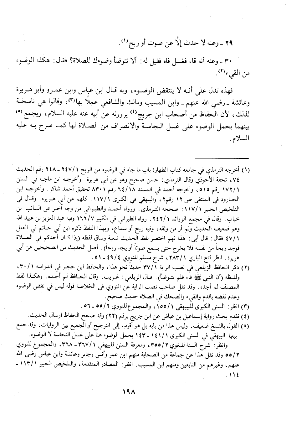 (¬1) أخرجه الترمذي في جامعه كتاب الطهارة باب ما جاء في الوضوء من الريح 1/ 247 - 248 رقم الحديث 74، تحفة الأحوذي وقال الترمذي: حسن صحيح وهو عن أبي هريرة. وأخرجه ابن ماجه في السنن 1/ 172 رقم 515، وأخرجه أحمد في المسند 18/ 64 رقم 8301 تحقيق أحمد شاكر. وأخرجه ابن الجارود في المنتقى ص 12 رقم 2، والبيهقي في الكبرى 1/ 117. كلهم عن أبي هريرة. وقال في التلخيص الحبير 1/ 117: صححه الترمذي. ورواه أحمد والطبراني من وجه آخر عن السائب بن خباب. وقال في مجمع الزوائد 1/ 242: رواه الطبراني في الكبير 7/ 166 وفيه عبد العزيز بن عبيد الله وهو ضعيف الحديث ولم أر من وثقه، وفيه ريح أو سماع، وبهذا اللفظ ذكره ابن أبي حاتم في العلل 1/ 47 فقال: قال أبي: هذا نهم اختصر لفظ الحديث شعبة وساق لفظه (إذا كان أحدكم في الصلاة فوجد ريحًا من نفسه فلا يخرج حتى يسمع صوتًا أو يجد ريحًا). أصل الحديث من الصحيحين عن أبي هريرة. انظر فتح الباري 1/ 283، شرح مسلم للنووي 4/ 49 - 51.