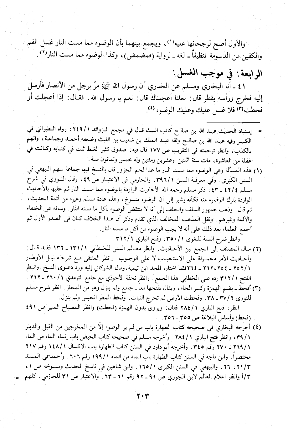 (¬1) هذد المسألة وهي الوضوء مما مست النار ما عدا لحم الجزور قال بالنسخ فيها جماعة منهم البيهقي في السنن الكبرى. وفى معرفة السنن 1/ 396، والحازمي في الاعتبار ص 49، وقال النووي في شرح مسلم 4/ 42 - 43: ذكر مسلم رحمه الله الأحاديث الواردة بالوضوء مما مست النار ثم عقبها بالأحاديث الواردة بترك الوضوء منه فكأنه يشير إلى أن الوضوء منسوخ، وهذه عادة مسلم وغيره من أئمة الحديث، ثم قال: وذهب جمهور السلف والخلف إلى أنه لا ينتقض الوضوء بأكل ما مسته النار. وساقه عن الخلفاء والأئمة وغيرهم. ونقل المذهب المخالف الذي تقدم وذكر أن هذا الخلاف كان في الصدر الأول ثم أجمع العلماء بعد ذلك على أنه لا يجب الوضوء من أكل ما مسته النار.