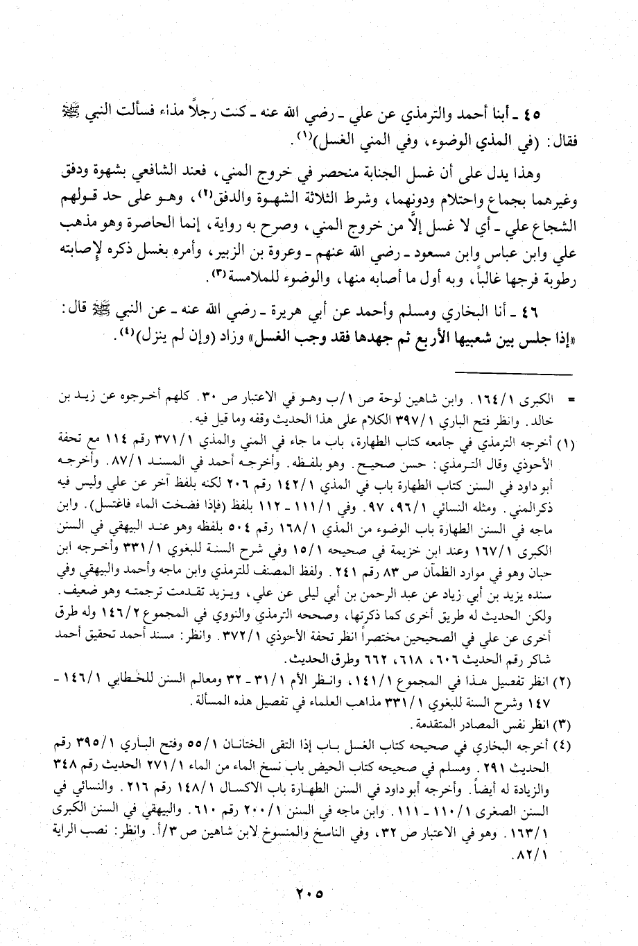 45 - أبنا أحمد والترمذي عن علي- رضي الله عنه- كنت رجلًا مذاء فسألت النبي - صلى الله عليه وسلم - فقال: (في المذي الوضوء، وفي المني الغسل) (¬1).