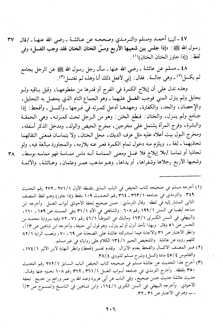 47 - أبنا أحمد ومسلم والترمذي وصححه عن عائشة- رضي الله عنها- قال رسول الله - صلى الله عليه وسلم -: "إذا جلس بين شعبيها الأربع ومسّ الختان الختان فقد وجب الغسل" وفي لفظ: (إذا جاوز الختان الختان) (¬1).