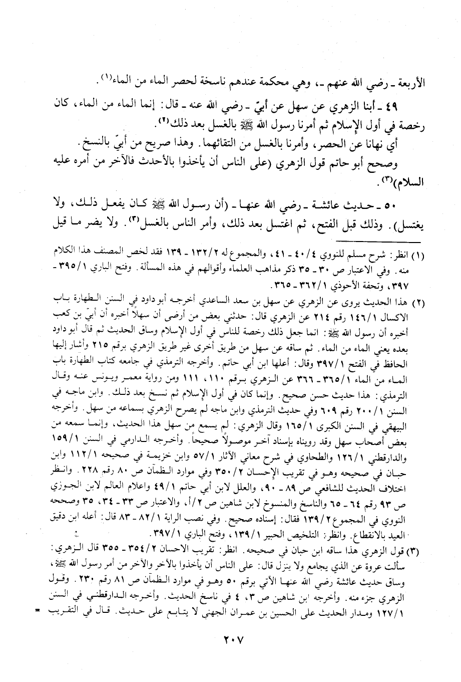 50 - حديث عائشة- رضي الله عنها- (أن رسول الله - صلى الله عليه وسلم - كان يفعل ذلك، ولا يغتسل). وذلك قبل الفتح، ثم اغتسل بعد ذلك، وأمر الناس بالغسل (3). ولا يضر ما قيل