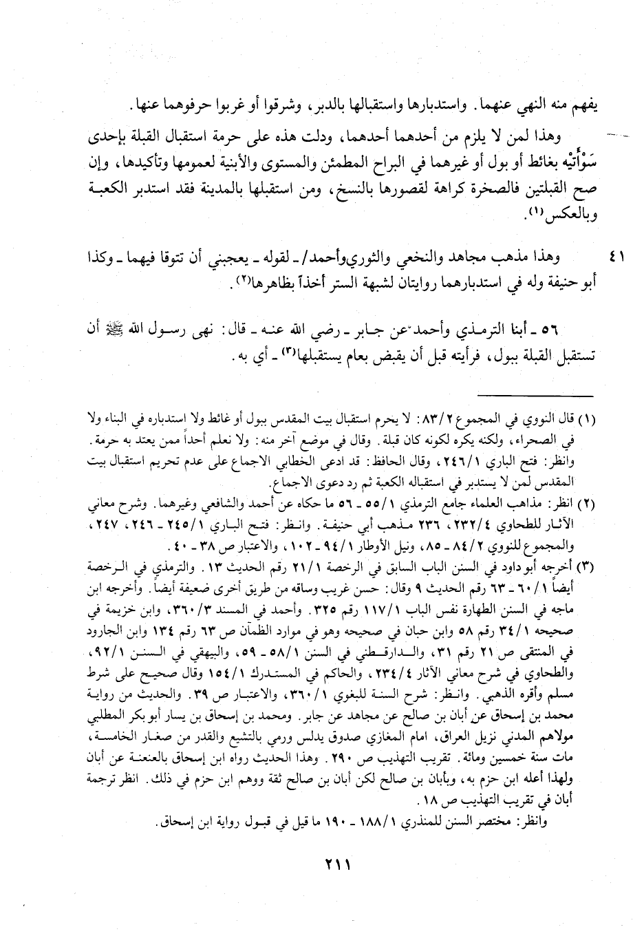 56 - أبنا الترمذي وأحمد عن جابر- رضي الله عنه- قال: نهى رسول الله - صلى الله عليه وسلم - أن تستقبل القبلة ببول، فرأيته قبل أن يقبض بعام يستقبلها (¬3) - أي به.