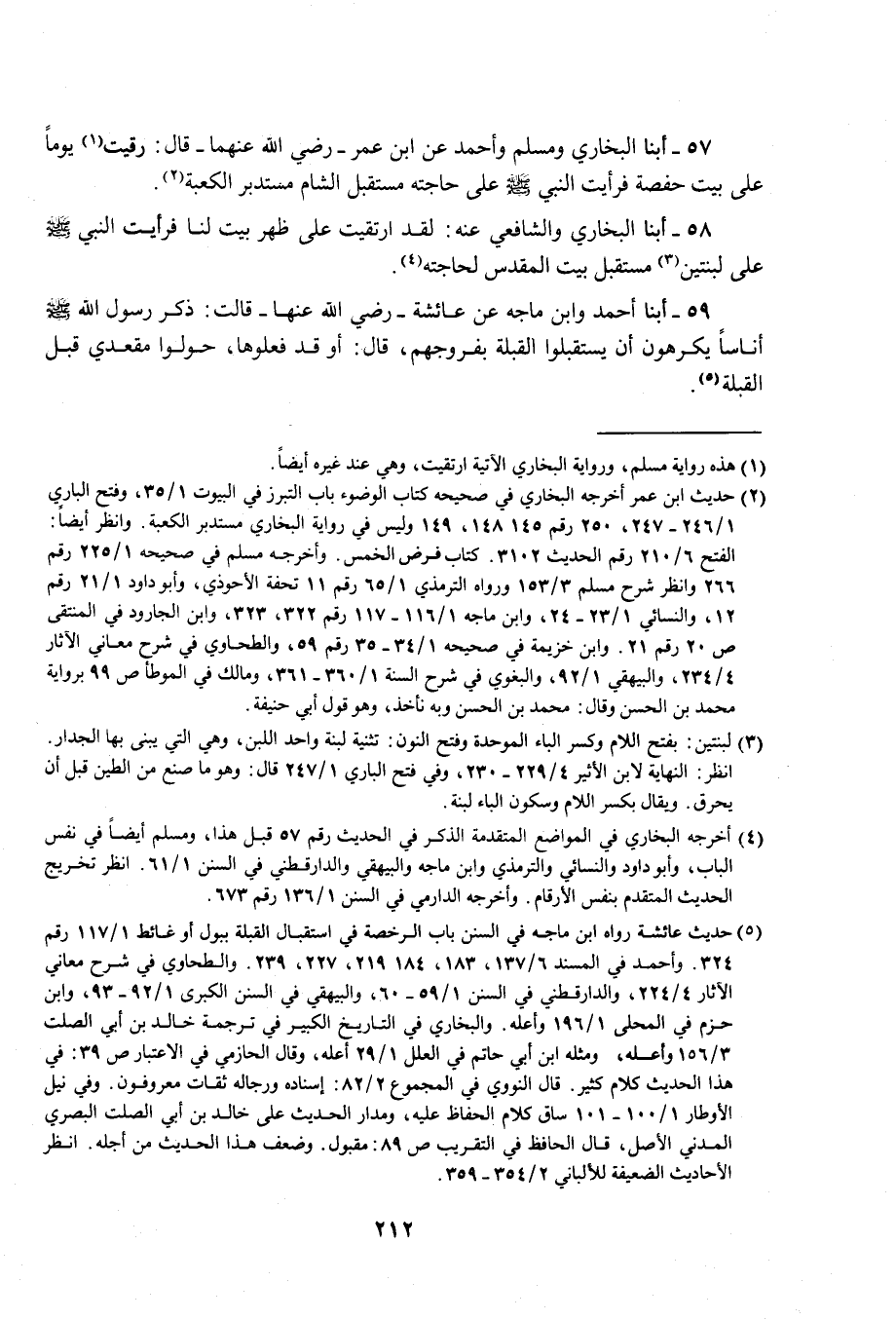 58 - أبنا البخاري والشافعي عنه: لقد ارتقيت على ظهر بيت لنا فرأيت النبي - صلى الله عليه وسلم - على لبنتين (¬3) مستقبل بيت المقدس لحاجته (¬4).