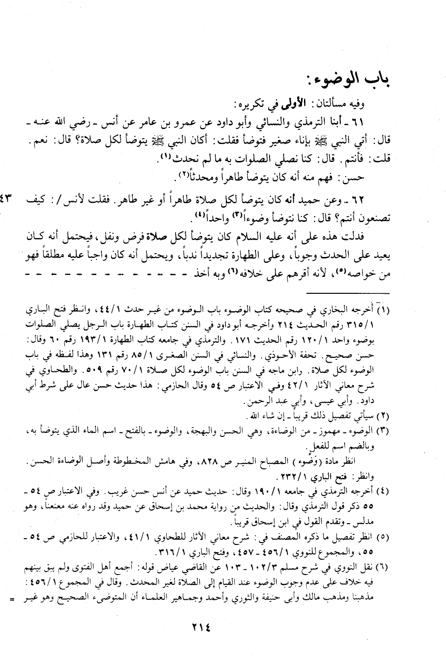 61 - أبنا الترمذي والنسائي وأبو داود عن عمرو بن عامر عن أنس- رضي الله عنه- قال: أتي النبي - صلى الله عليه وسلم - بإناء صغير فتوضأ فقلت: أكان النبي - صلى الله عليه وسلم - يتوضأ لكل صلاة؟ قال: نعم. قلت: فأنتم. قال: كنا نصلي الصلوات به ما لم نحدث (¬1).