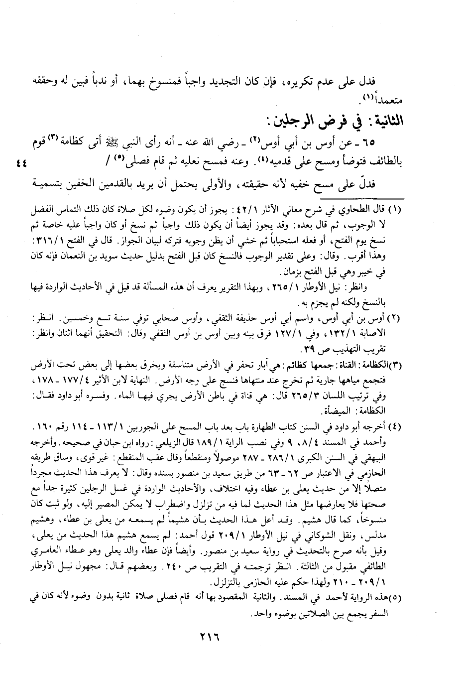 65 - عن أوس بن أبي أوس (¬2) - رضي الله عنه- أنه رأى النبي - صلى الله عليه وسلم - أتى كظامة (¬3) قوم باب فتوضأ ومسح على قدميه (¬4). وعنه فمسح نعليه ثم قام فصلى (¬5).
