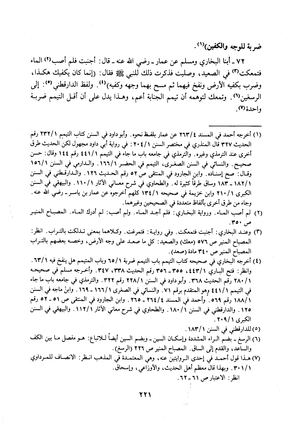 (¬4) أخرجه البخاري في صحيحه كتاب التيمم باب التيمم ضربة 1/ 65 وباب المتيمم هل ينفخ فيه 1/ 63. وانظر: فتح الباري 1/ 443، 355 - 356 رقم الحديث 338، 347. وأخرجه مسلم في صحيحه 1/ 280 رقم الحديث 368. وأبو داود في السنن 1/ 228 رقم 322. والترمذي في جامعه باب ما جاء في التيمم 1/ 441 وهو المتقدم برقم 71. والنسائي في الصغرى 1/ 166 - 169. وابن ماجه في السنن 1/ 188 رقم 569. وأحمد في المسند 4/ 264 - 265. وابن الجارود في المنتقى ص 51 - 52 رقم 125. والدارقطني في السنن 1/ 180. والطحاوي في شرح معاني الآثار 1/ 112. والبيهقي في السنن الكبرى 1/ 209.