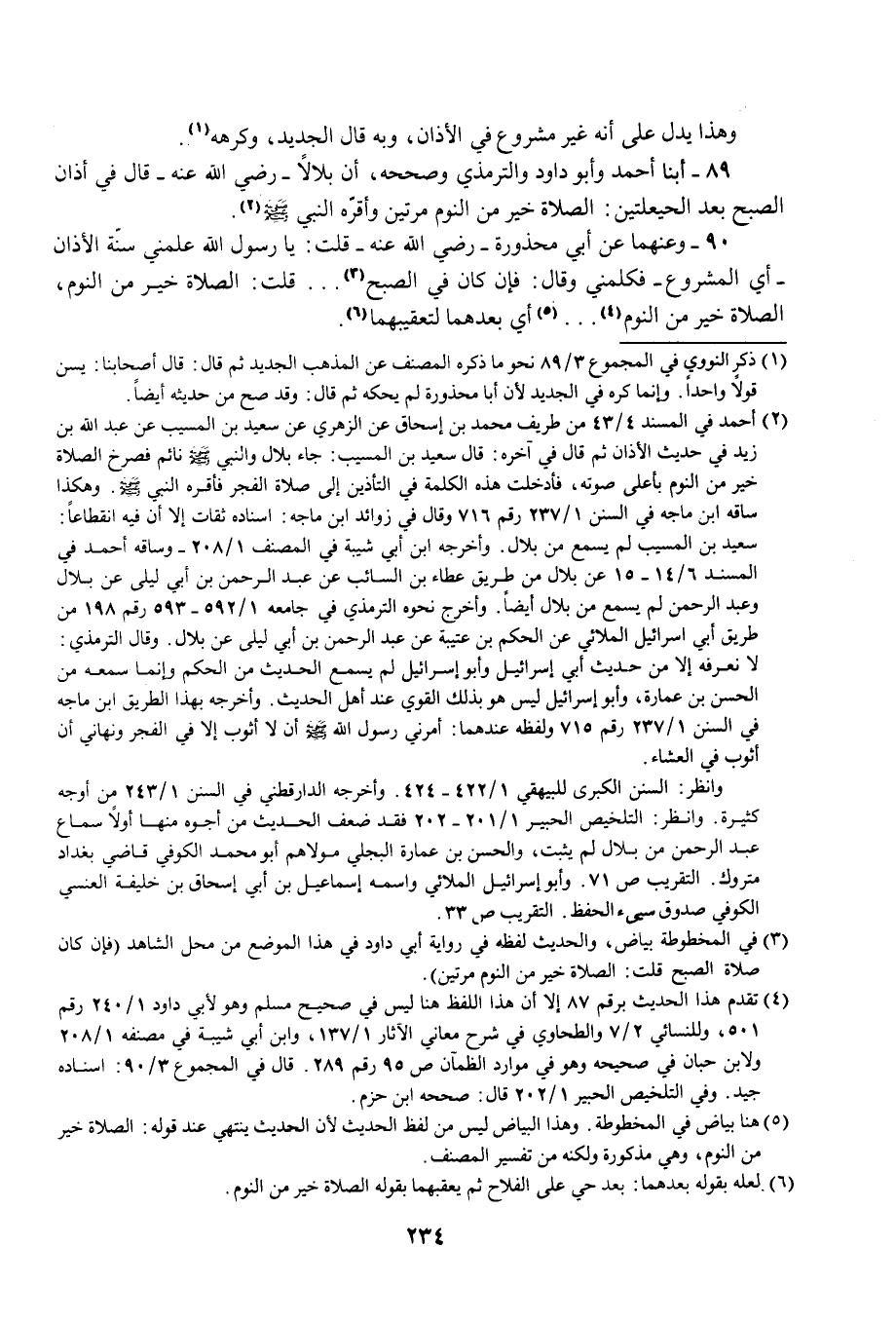 89 - أبنا أحمد وأبو داود والترمذي وصححه، أن بلالًا- رضي الله عنه- قال فى أذان الصبح بعد الحيعلتين: الصلاة خير من النوم مرتين وأقرّه النبي - صلى الله عليه وسلم - (¬2).