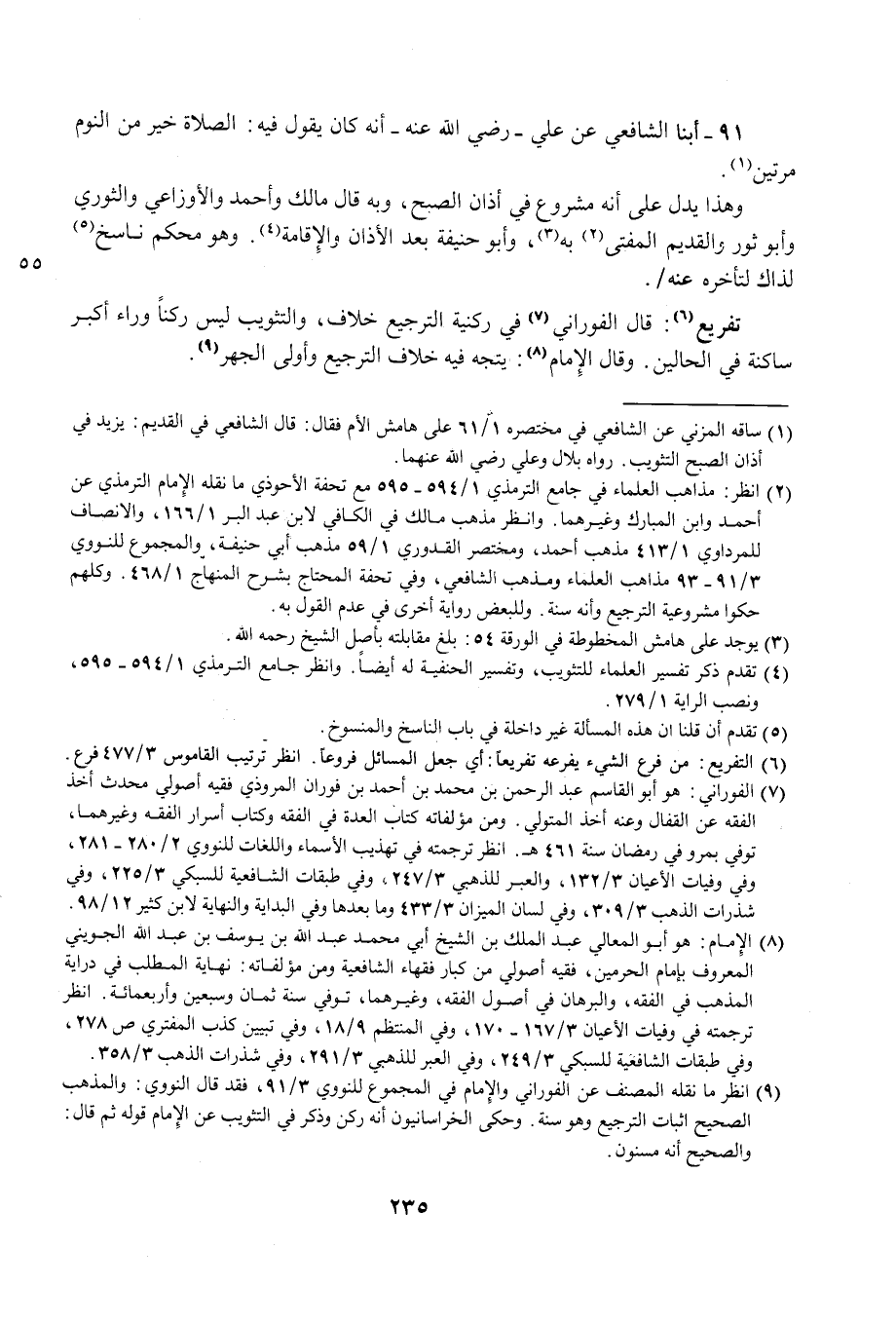 (¬9) انظر ما نقله المصنف عن الفوراني والإمام في المجموع للنووي 3/ 91، فقد قال النووي: والمذهب الصحيح إثبات الترجيع وهو سنة. وحكى الخراسانيون أنه ركن وذكر في التثويب عن الإِمام قوله ثم قال: والصحيح أنه مسنون.