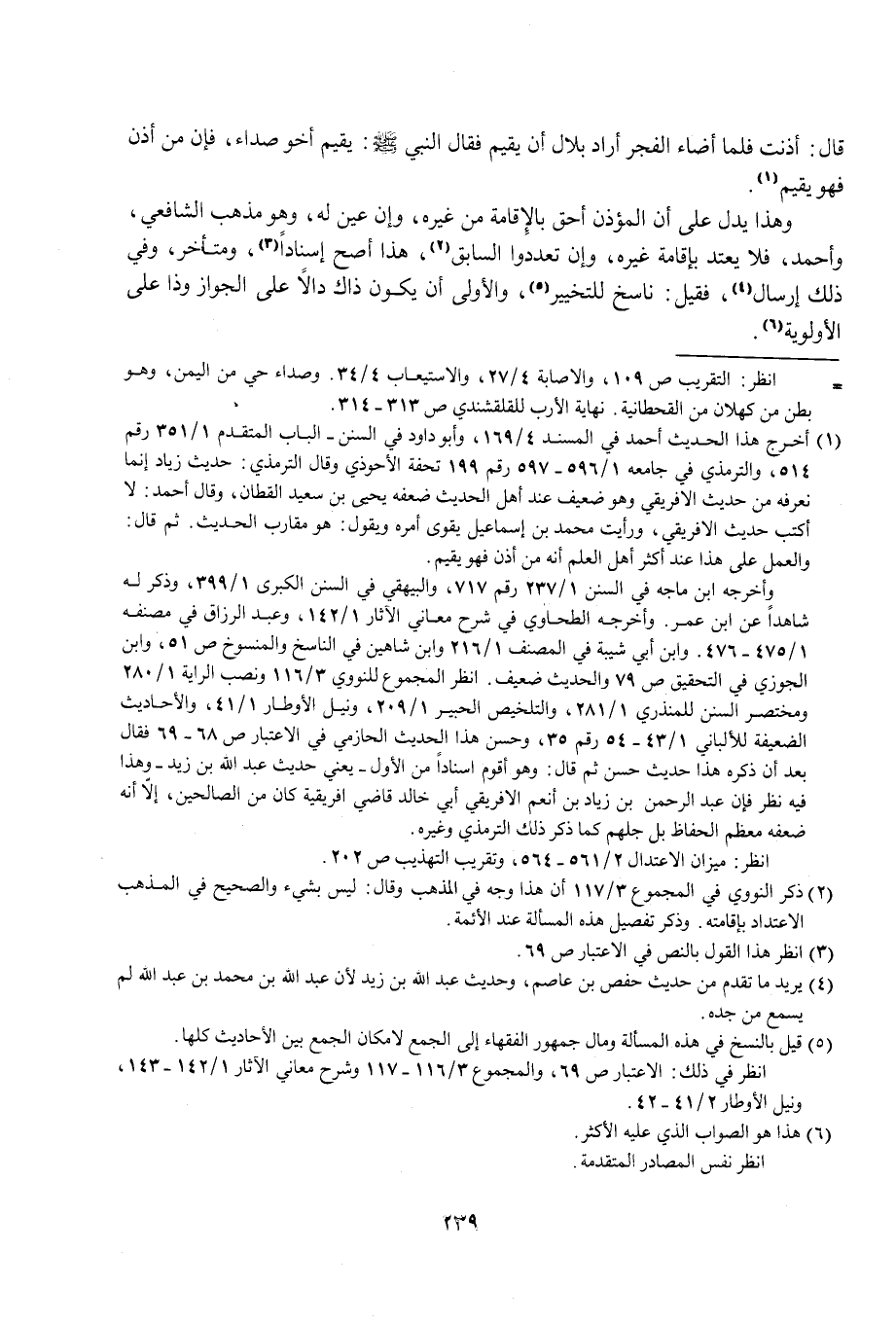 (¬1) أخرج هذا الحديث أحمد في المسند 4/ 169، وأبو داود في السنن- الباب المتقدم 1/ 351 رقم 514، والترمذي في جامعه 1/ 596 - 597 رقم 199 تحفة الأحوذي وقال الترمذي: حديث زياد إنما نعرفه من حديث الإفريقي وهو ضعيف عند أهل الحديث ضعفه يحيى بن سعيد القطان، وقال أحمد: لا أكتب حديث الإفريقي، ورأيت محمد بن إسماعيل يقوى أمره ويقول: هو مقارب الحديث. ثم قال: والعمل على هذا عند أكثر أهل العلم أنه من أذن فهو يقيم.