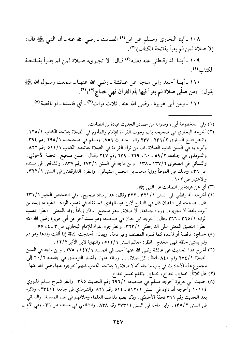 (¬2) أخرجه البخاري في صحيحه باب وجوب القراءة للإِمام والمأموم في الصلاة بفاتحة الكتاب 1/ 125. وانظر فتح الباري 2/ 236 - 237 رقم الحديث 756. ومسلم في صحيحه 1/ 295 رقم 394. وأبو داود في السنن كتاب الصلاة باب من ترك القراءة في الصلاة بفاتحة الكتاب 1/ 511 رقم 822. والترمذي في جامعه 2/ 59 - 60، 229 - 239 رقم 247 وقال: حسن صحيح. تحفة الأحوذي. والنسائي فى الصغرى 2/ 137 - 138. وابن ماجه في السنن 1/ 273 رقم 837. والشافعي في مسنده ص 36، ومالك في الموطأ رواية محمد بن الحسن الشيباني. وانظر: الدارقطني في السنن 1/ 322، والاعتبار ص 102.