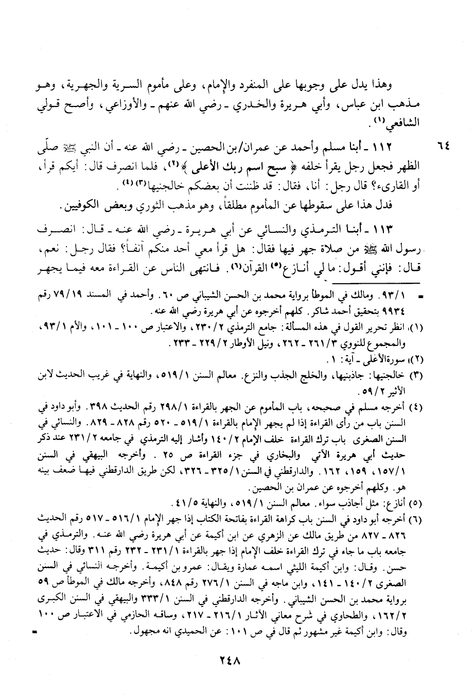 (¬4) أخرجه مسلم في صحيحه، باب المأموم عن الجهر بالقراءة 1/ 298 رقم الحديث 398. وأبو داود في السنن باب من رأى القراءة إذا لم يجهر الإِمام بالقراءة 1/ 519 - 520 رقم 828 - 829. والنسائي في السنن الصغرى باب ترك القراءة خلف الإمام 2/ 140 وأشار إليه الترمذي في جامعه 2/ 231 عند ذكر حديث أبي هريرة الآتي والبخاري في جزء القراءة ص 25. وأخرجه البيهقي في السنن 1/ 157، 159، 162. والدارقطني في السنن 1/ 325 - 326، لكن طريق الدارقطني فيها ضعف بينه هو. وكلهم أخرجوه عن عمران بن الحصين.
