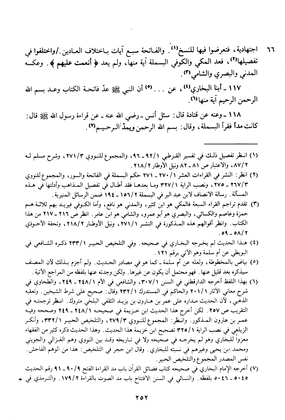 (¬2) انظر: النشر في القراءات العشر 1/ 270 - 271 حكم البسملة في الفاتحة والسور، والمجموع للنووي 3/ 267 - 275، ونصب الراية 1/ 327 وما بعدها فقد أطال في تفصيل المذاهب وأدلتها فى هذه المسألة. رسالة الانصاف لابن عبد البر في البسملة 2/ 156 - 194 ضمن الرسائل المنيرية.