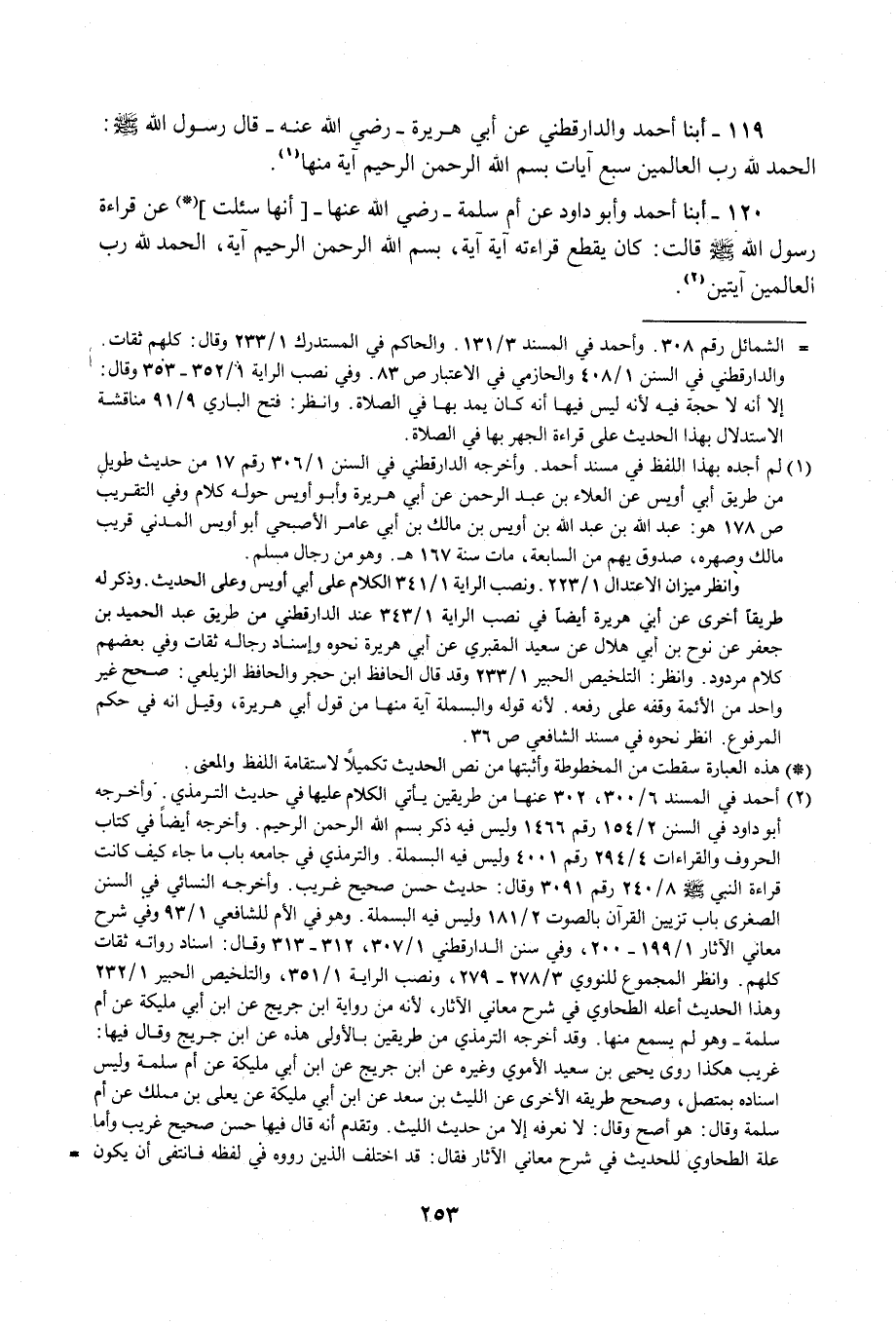 119 - أبنا أحمد والدارقطني عن أبي هريرة - رضي الله عنه - قال رسول الله - صلى الله عليه وسلم -: الحمد لله رب العالمين سبع آيات بِسْمِ اللَّهِ الرَّحْمَنِ الرَّحِيمِ آية منها (¬1).
