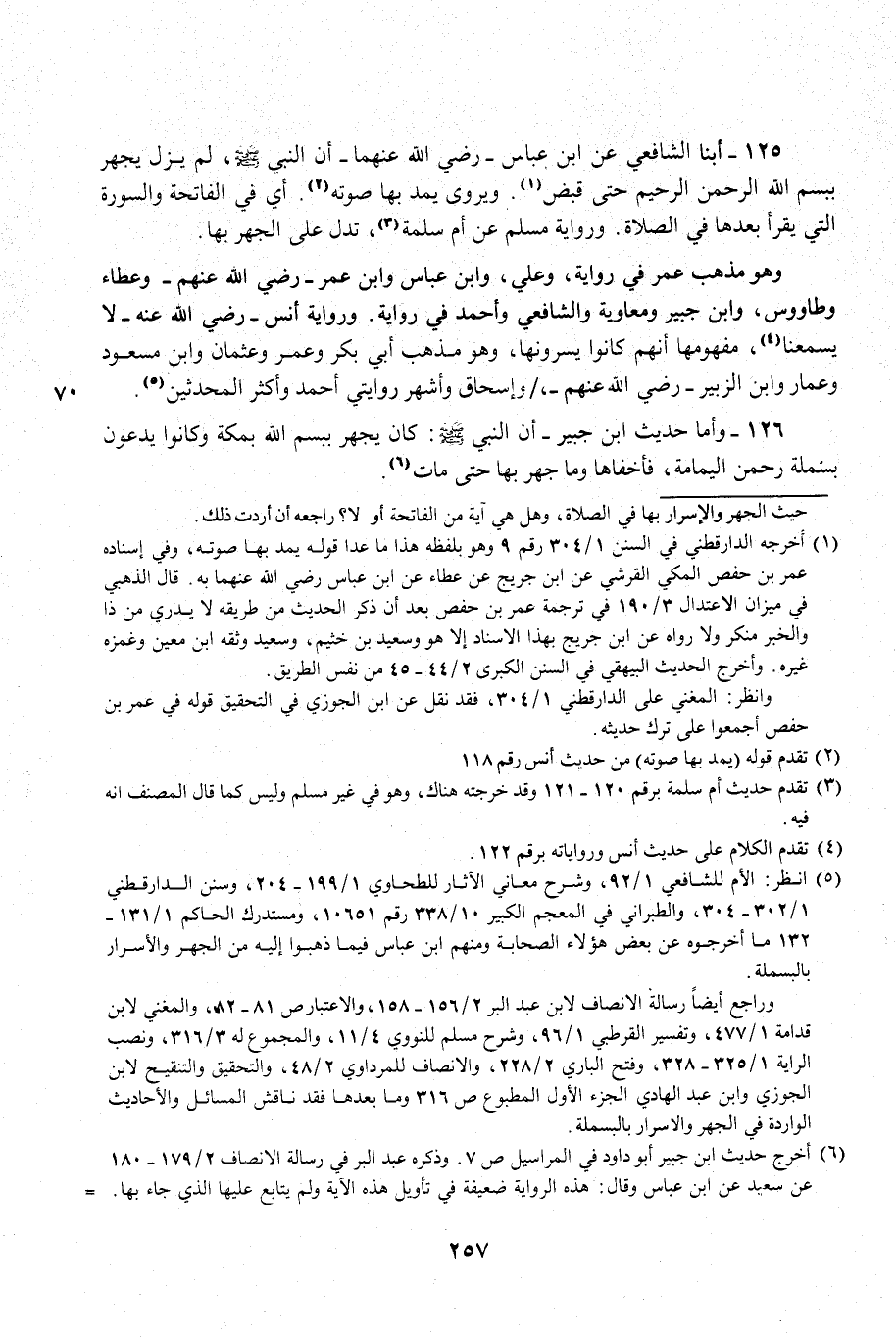 وراجع أيضًا رسالة الانصاف لابن عبد البر 2/ 156 - 158، والاعتبار ص 81 - 82، والمغني لابن قدامة 1/ 477، وتفسير القرطبي 1/ 96، وشرح مسلم للنووي 4/ 11، والمجموع له 3/ 316، ونصب الراية 1/ 325 - 328، وفتح الباري 2/ 228، والانصاف للمرداوي 2/ 48، والتحقيق والتنقيح لابن الجوزي وابن عبد الهادي الجزء الأول المطبوع ص 316 وما بعدها فقد ناقش المسائل والأحاديث الواردة في الجهر والاسرار بالبسملة.