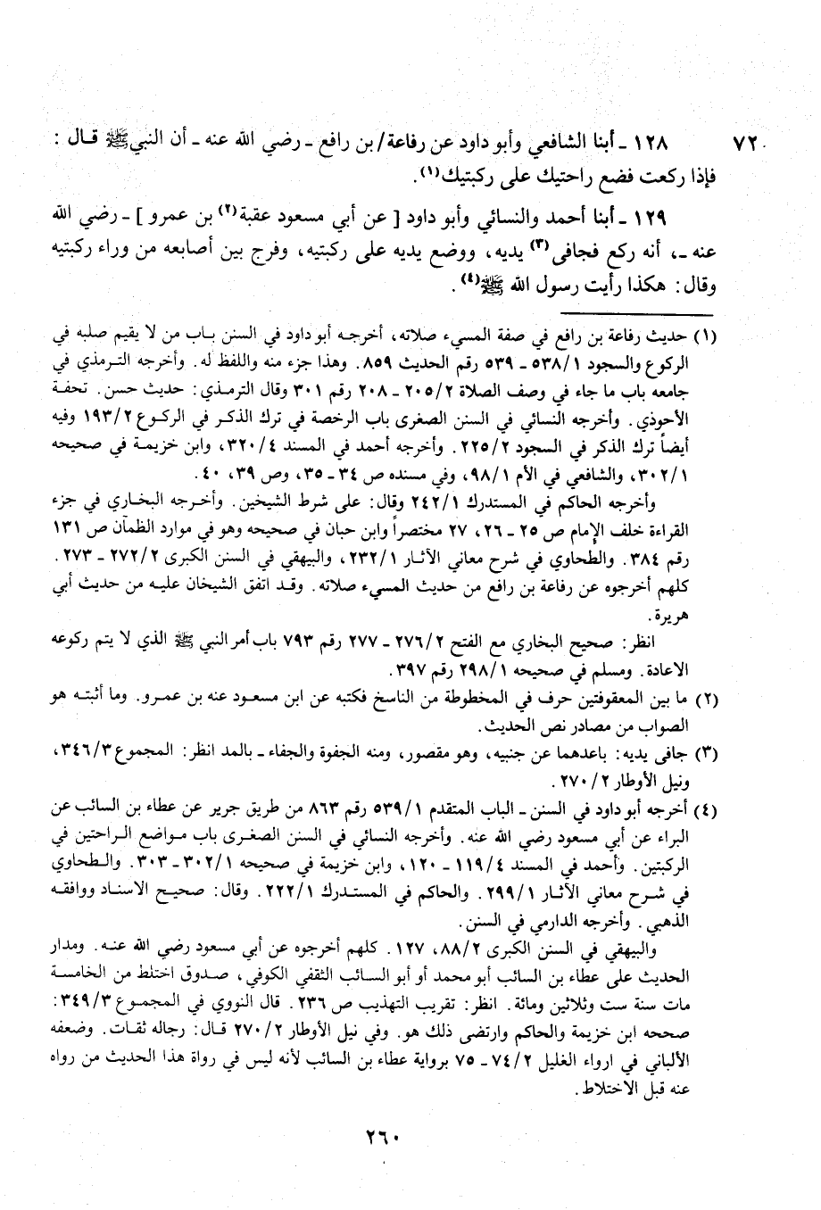 128 - أبنا الشافعي وأبو داود عن رفاعة بن رافع - رضي الله عنه - أن النبي - صلى الله عليه وسلم - قال: فإذا ركعت فضع راحتيك على ركبتيك (¬1).